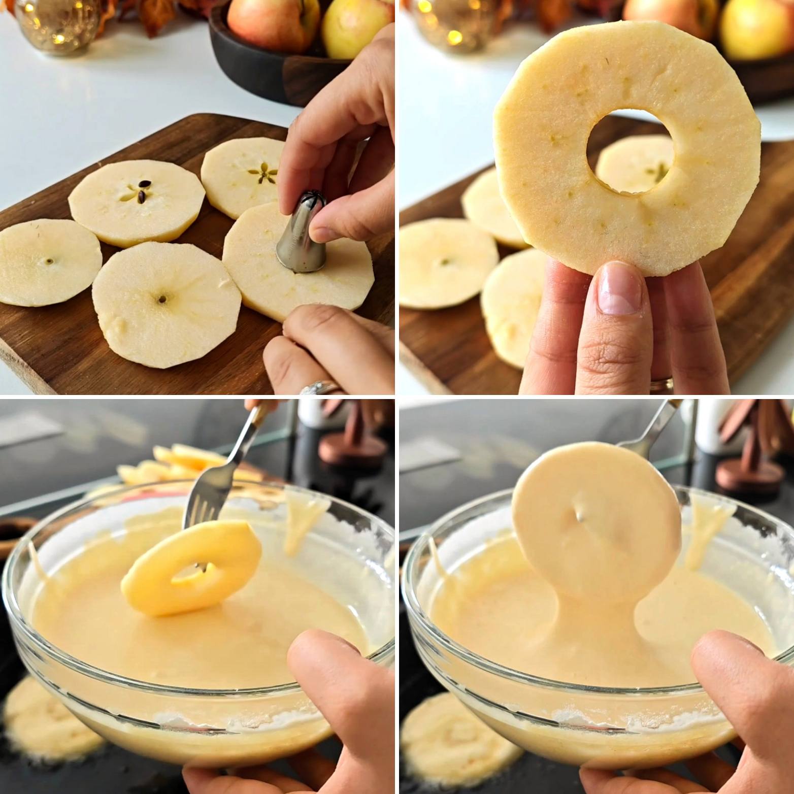 6. Trempez chaque rondelle de pommes dans la pâte à beignet puis posez les délicatement dans l’huile