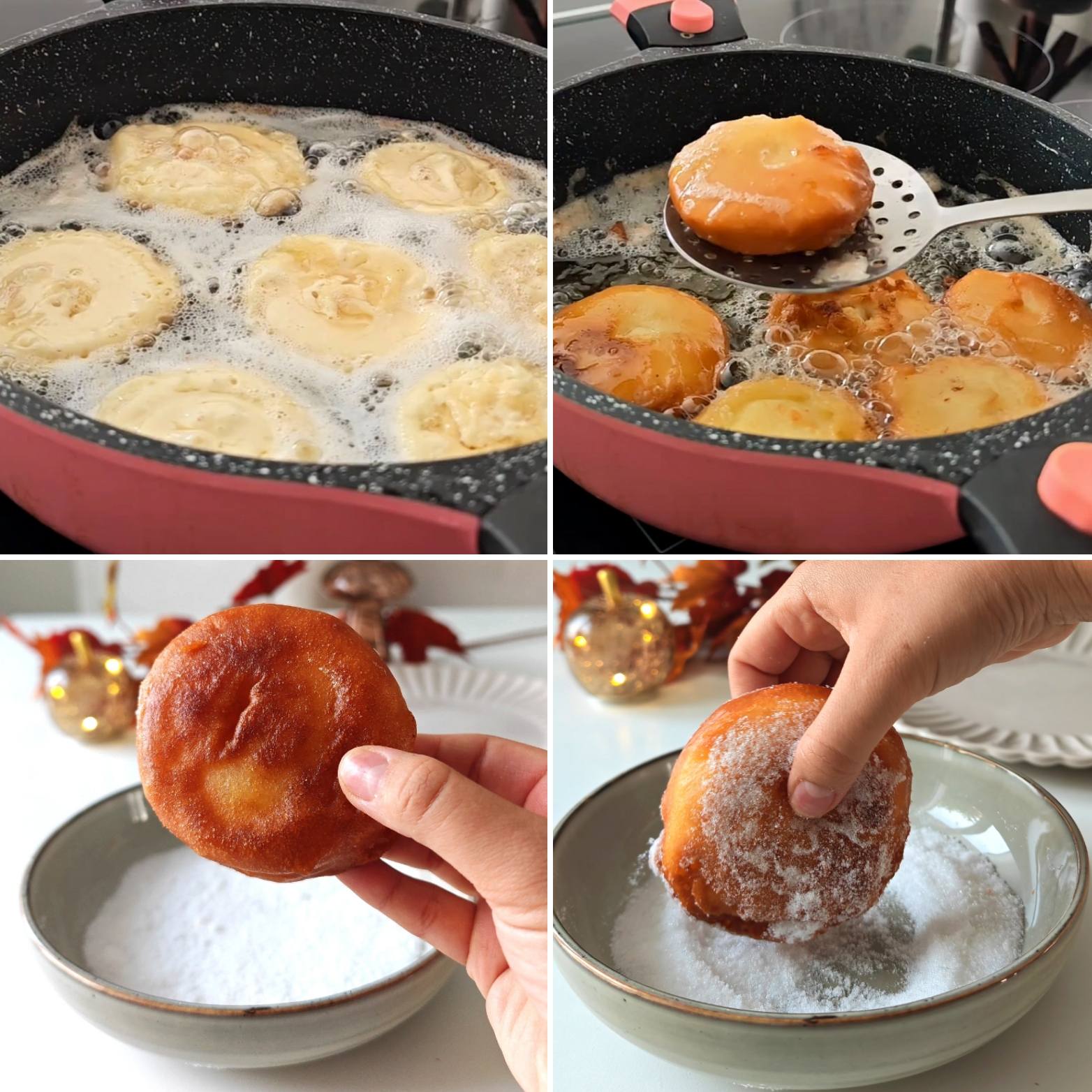 8. Enrobez les de sucre en poudre (vous pouvez ajouter de la cannelle) lorsqu’ils sont encore chauds (s’ils sont tièdes/froids le sucre ne tiendra pas)
