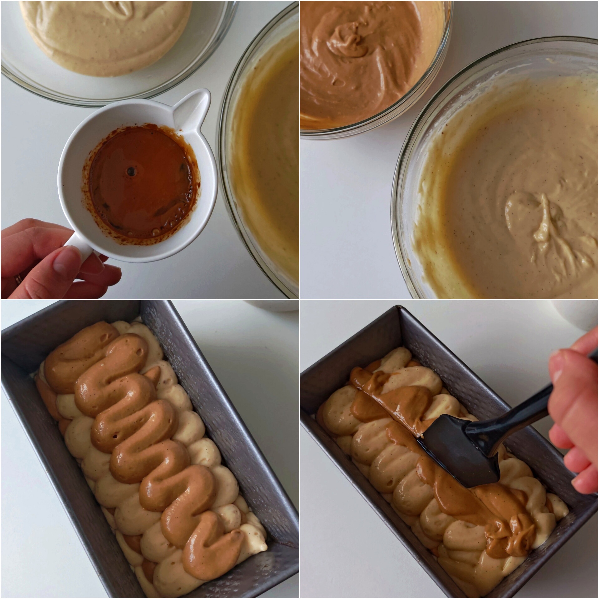 7. Graissez (beurre/farine ou spray de démoulage) un moule à cake de 20cm.Alternez les 2 pâtes puis à l’aide d’un couteau faites un zigzag dans la pâte