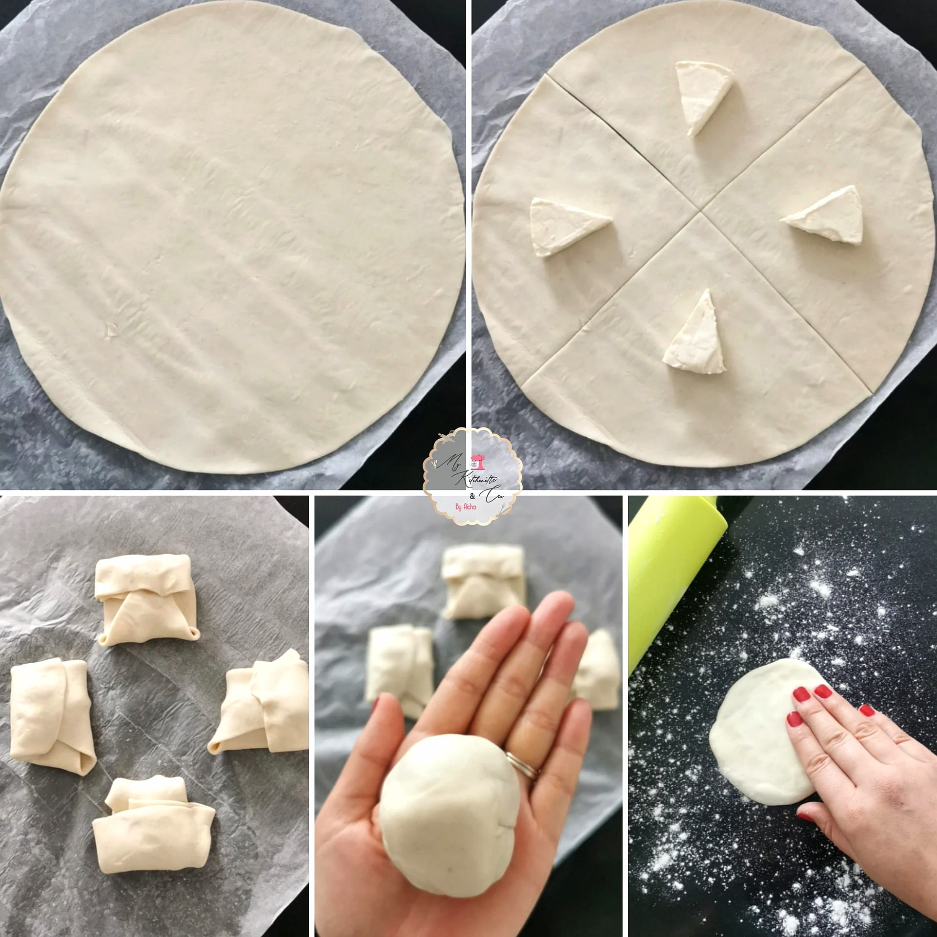 3.Farinez le plan de travail, étalez légèrement la boule à la main puis finement avec un rouleau à pâtisserie en appuyant doucement afin de ne pas faire sortir le fromage et/ou faire de trou