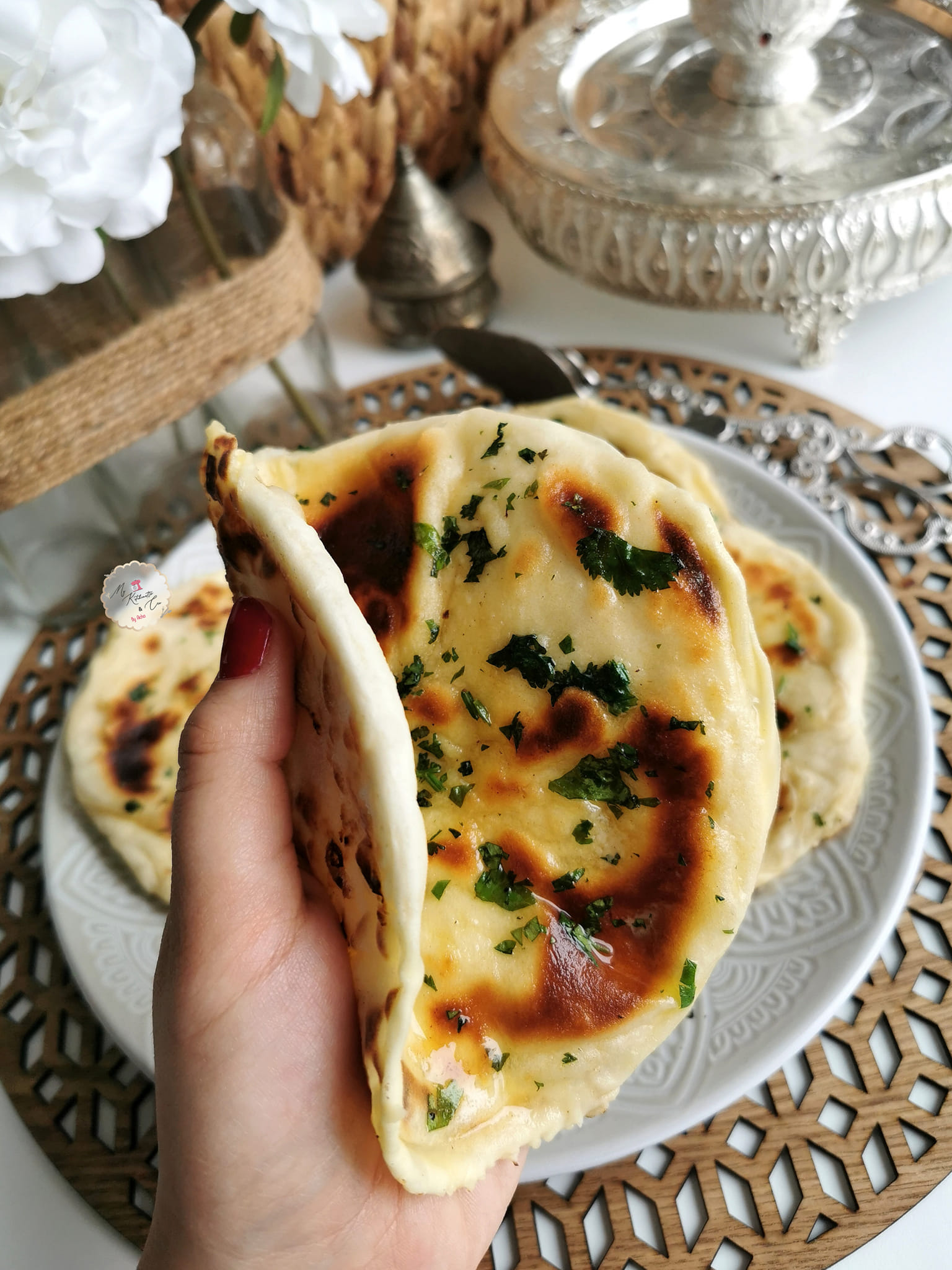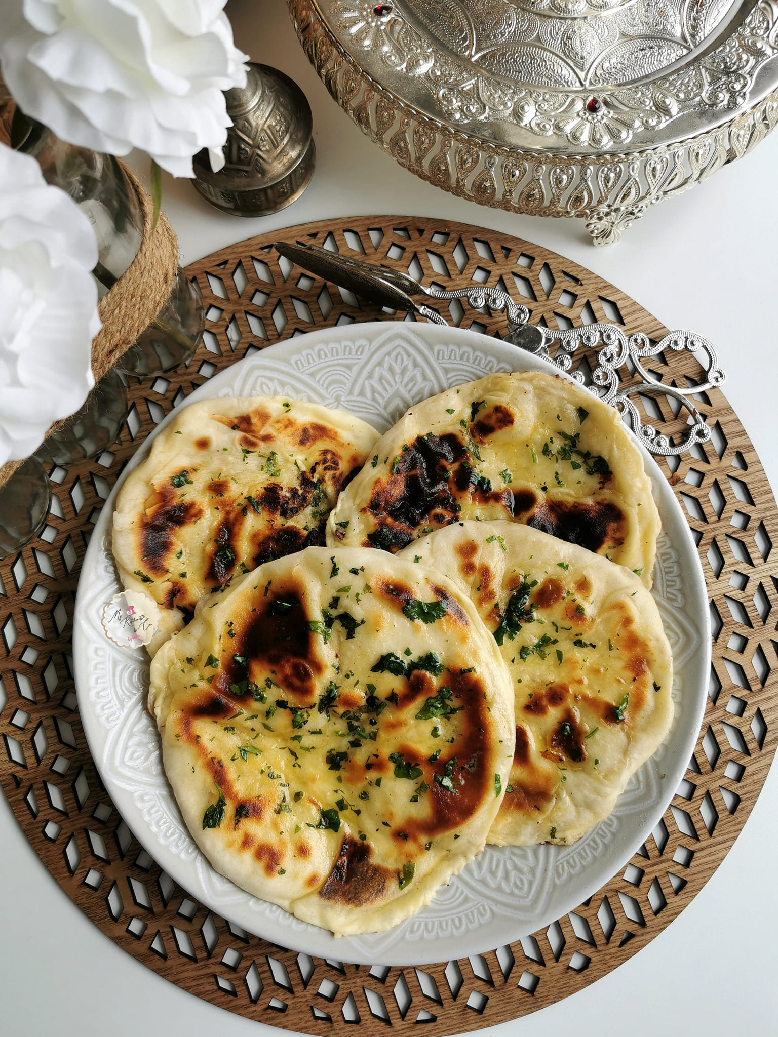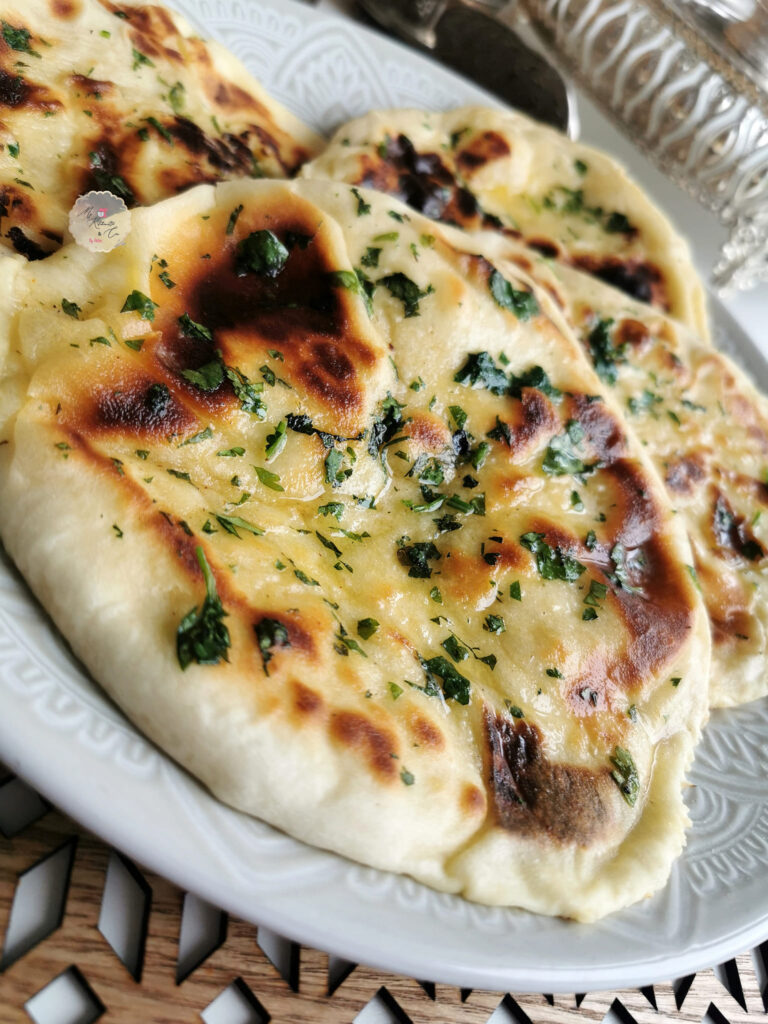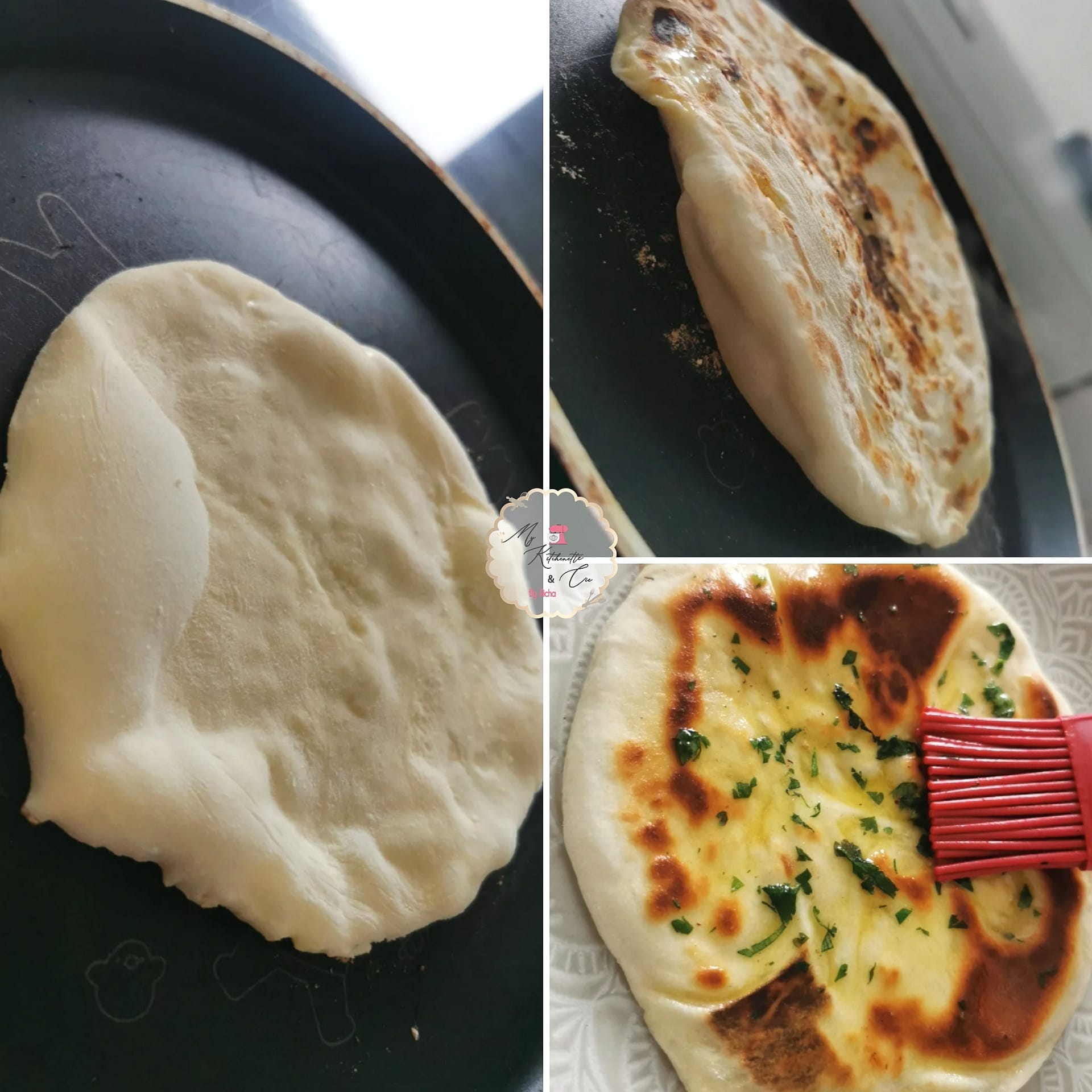 6.Une fois le naan cuit, réservez-le sur une assiette et badigeonnez d’un mélange beurre fondu/persil