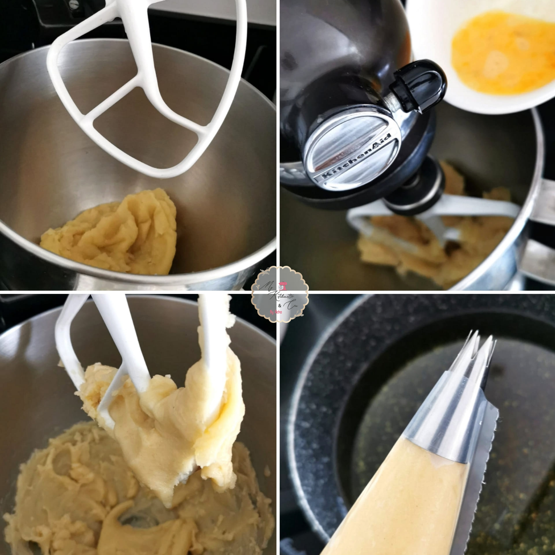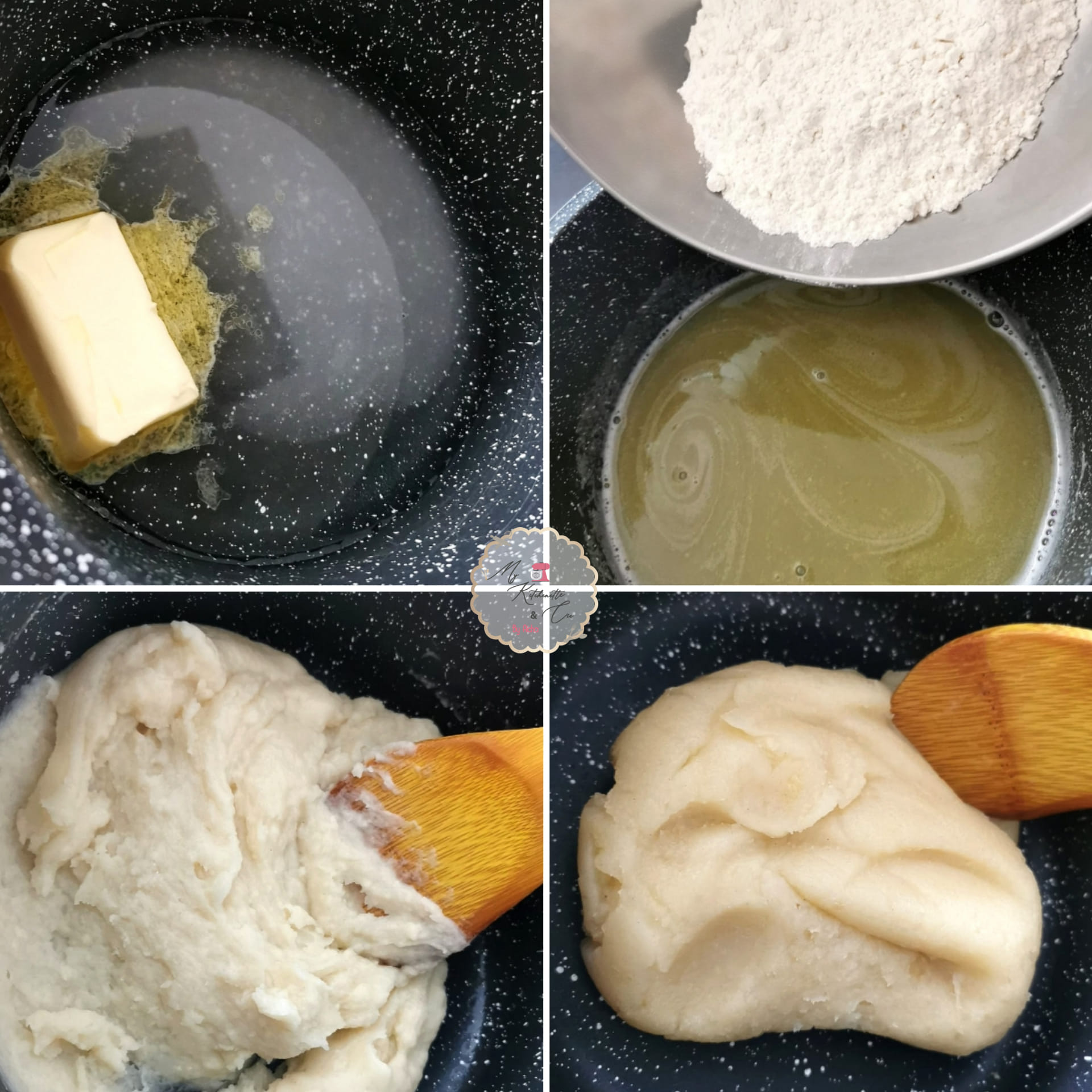 1.Pâte. Dans une casserole, faites chauffer : eau, beurre, sucre, sel