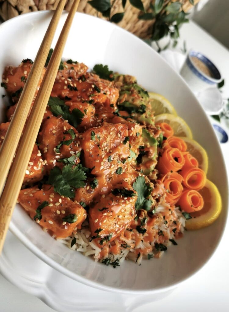 Façon « Bowl » avec du riz, de l’avocat et des carottes, le tout saupoudré de crispy oignons, de sésame, de coriandre et nappé de sauce.. Ces cubes de saumon fondant vont vous faire craquer à coup sûr !