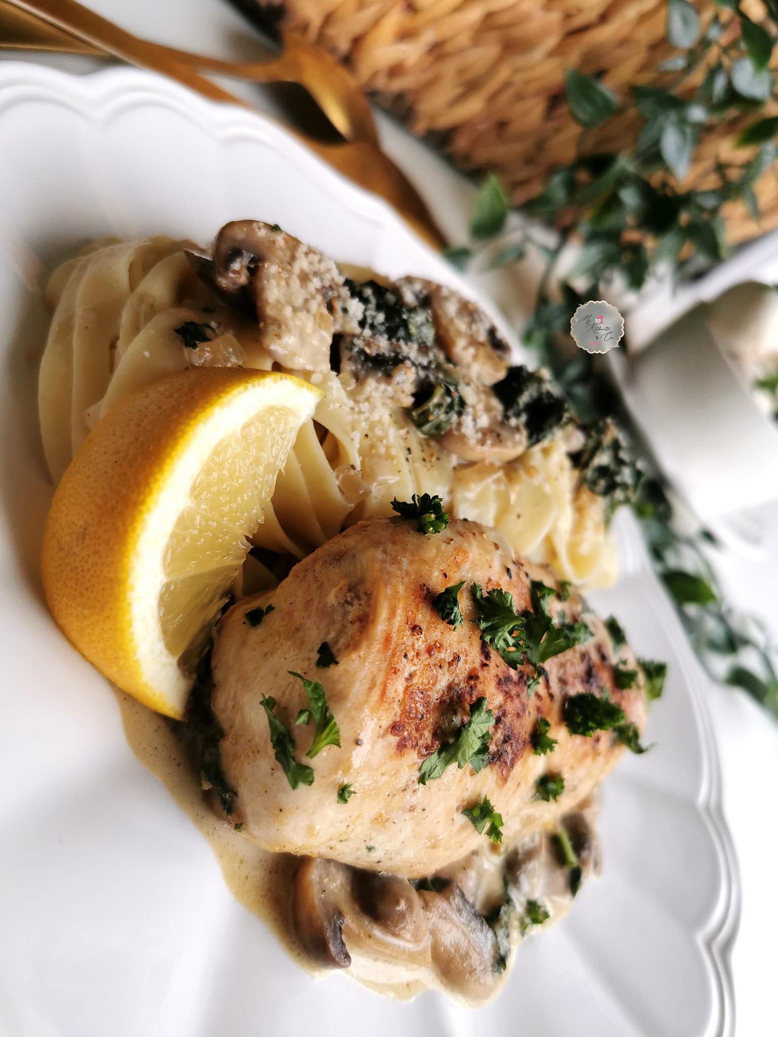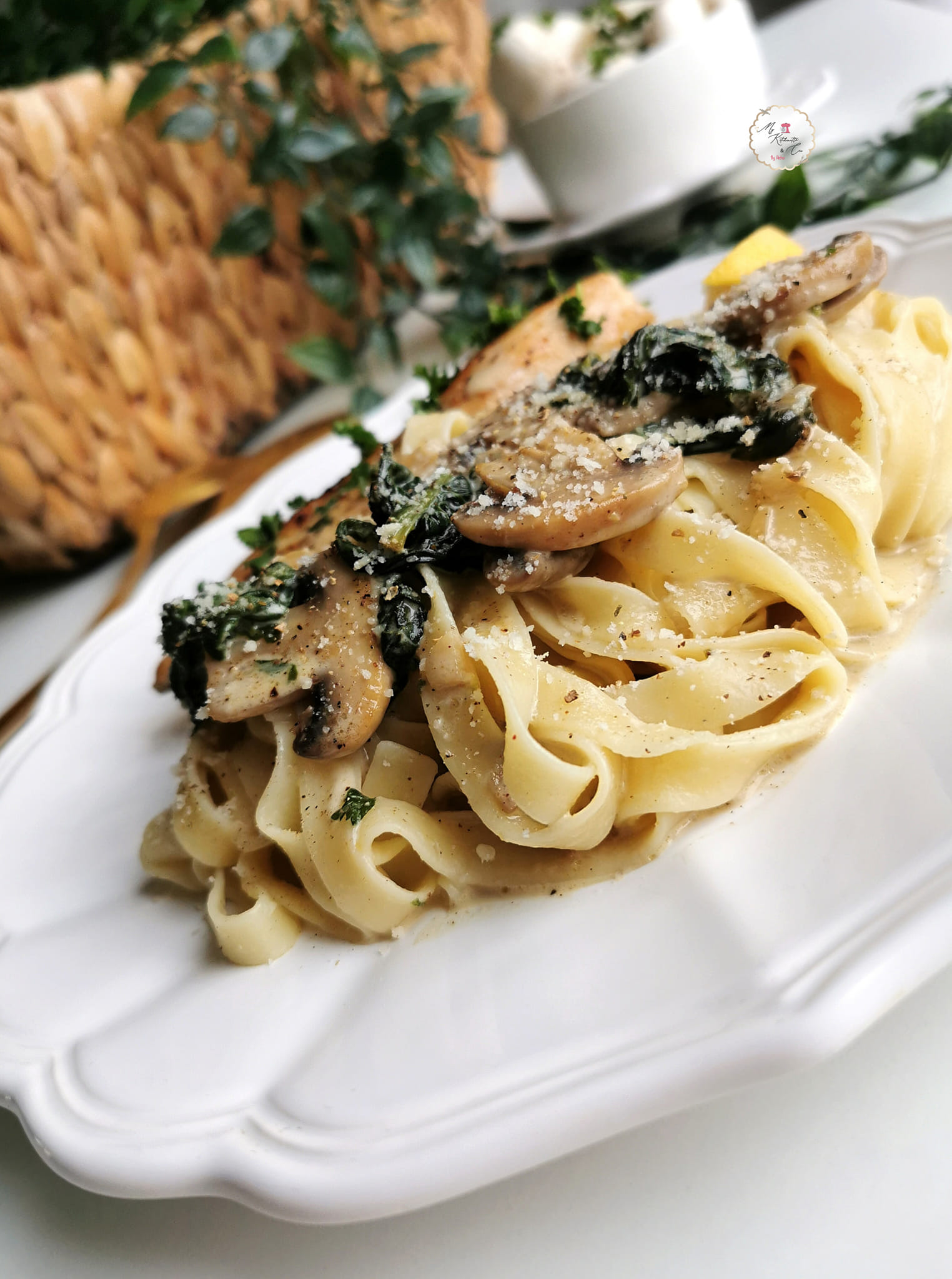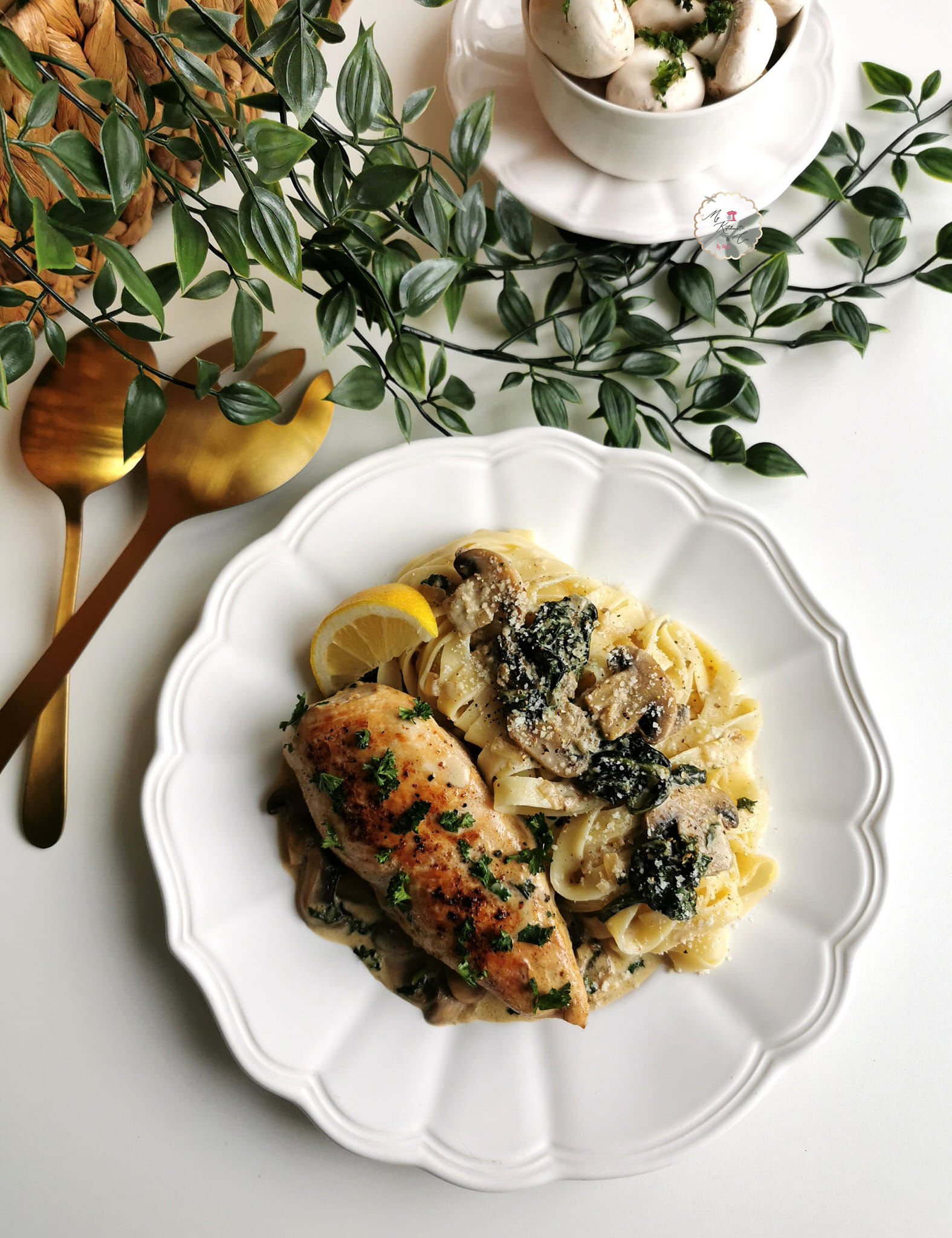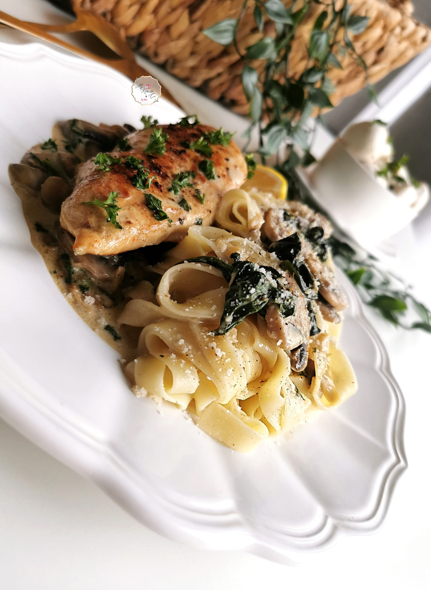 On craque donc pour ce savoureux filet de poulet doré qui finit sa cuisson dans une sauce crémeuse aux champignons et aux épinards, le tout servi avec de bonnes tagliatelles. Mmmm un délice
