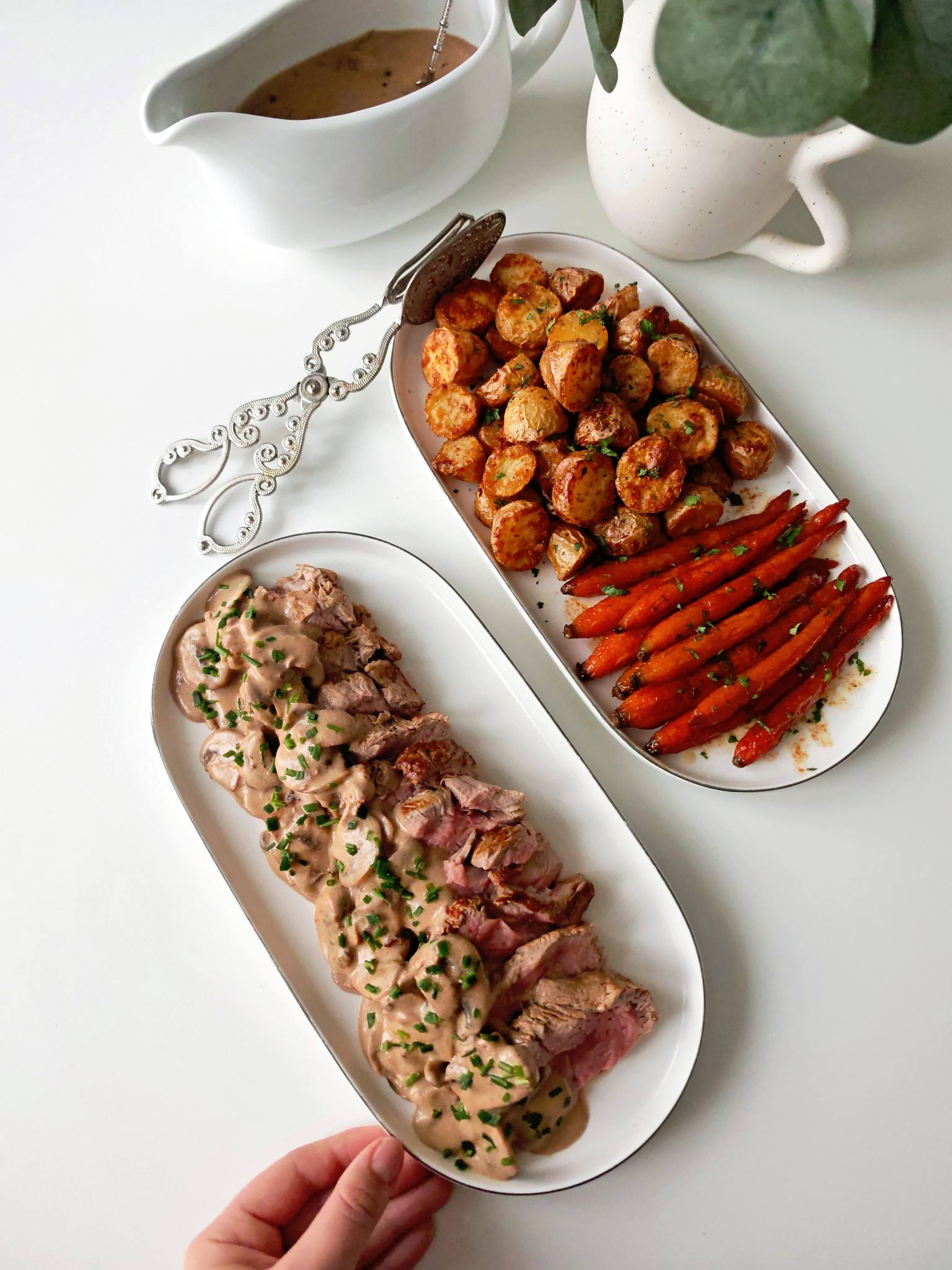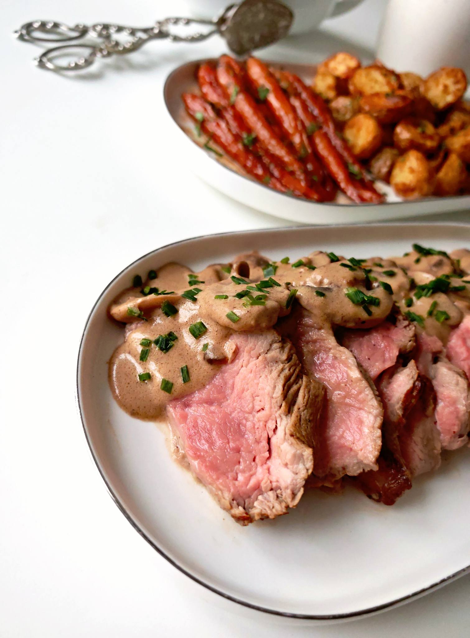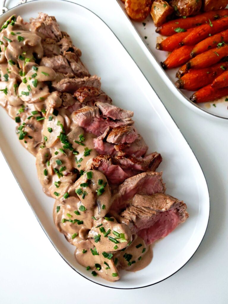 Un filet mignon de veau fondant, rosé à cœur, sublimé par une sauce aux champignons onctueuse, avec grenailles rôties au parmesan et carottes glacées fondantes.. Le plat parfait quand on reçoit et qu’on veut en mettre plein les yeux sans passer la journée en cuisine