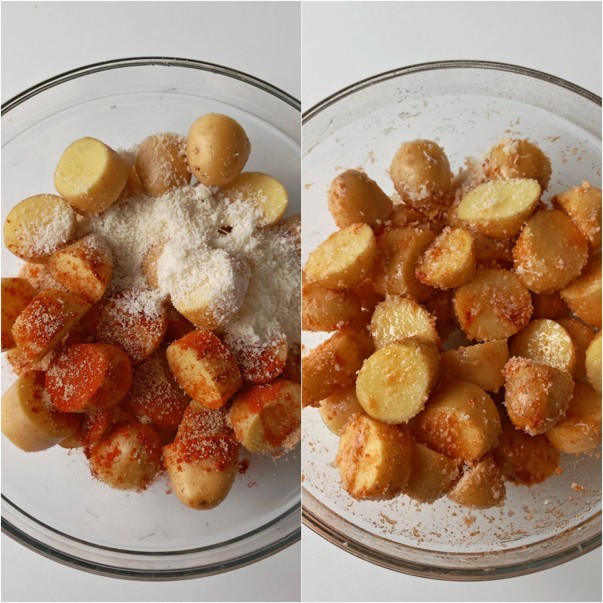 Grenailles : 800gr de pommes de terre grenailles + paprika + ail en poudre + sel + parmesan en poudre + huile neutre