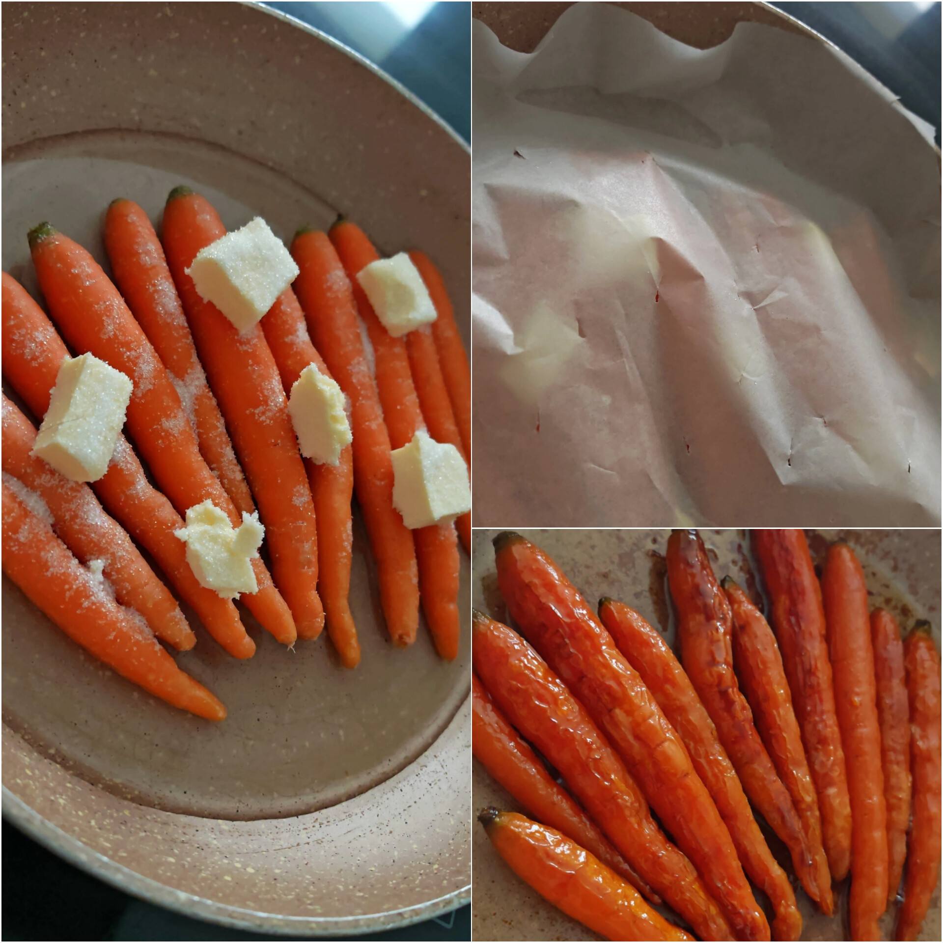 Carottes glacées de Joël Robuchon : une douzaine de petites carottes + 30gr de beurre + 1cc de sucre + eau + sel