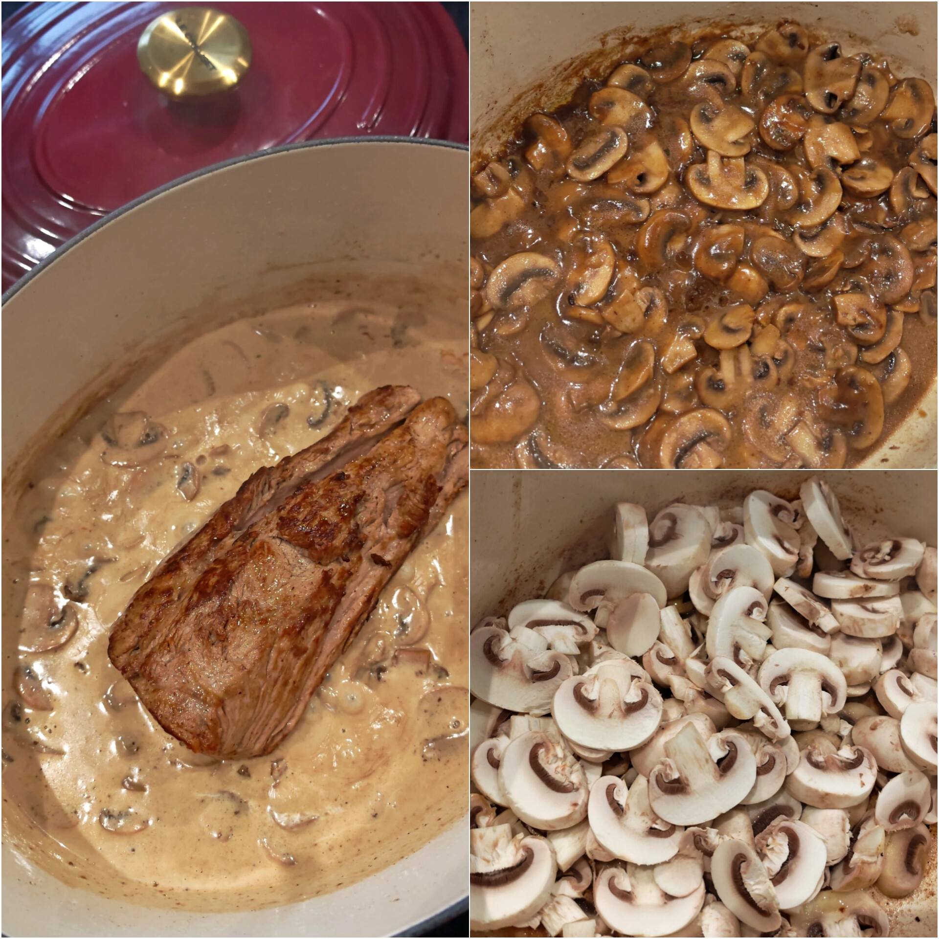 Filet mignon sauce aux champignons : 1 filet mignon de veau + 300gr de champignons frais de paris + 2cs de fond de veau + 100ml d’eau + 250ml de crème liquide + sel/poivre + 2cs d’huile neutre + 50gr de beurre