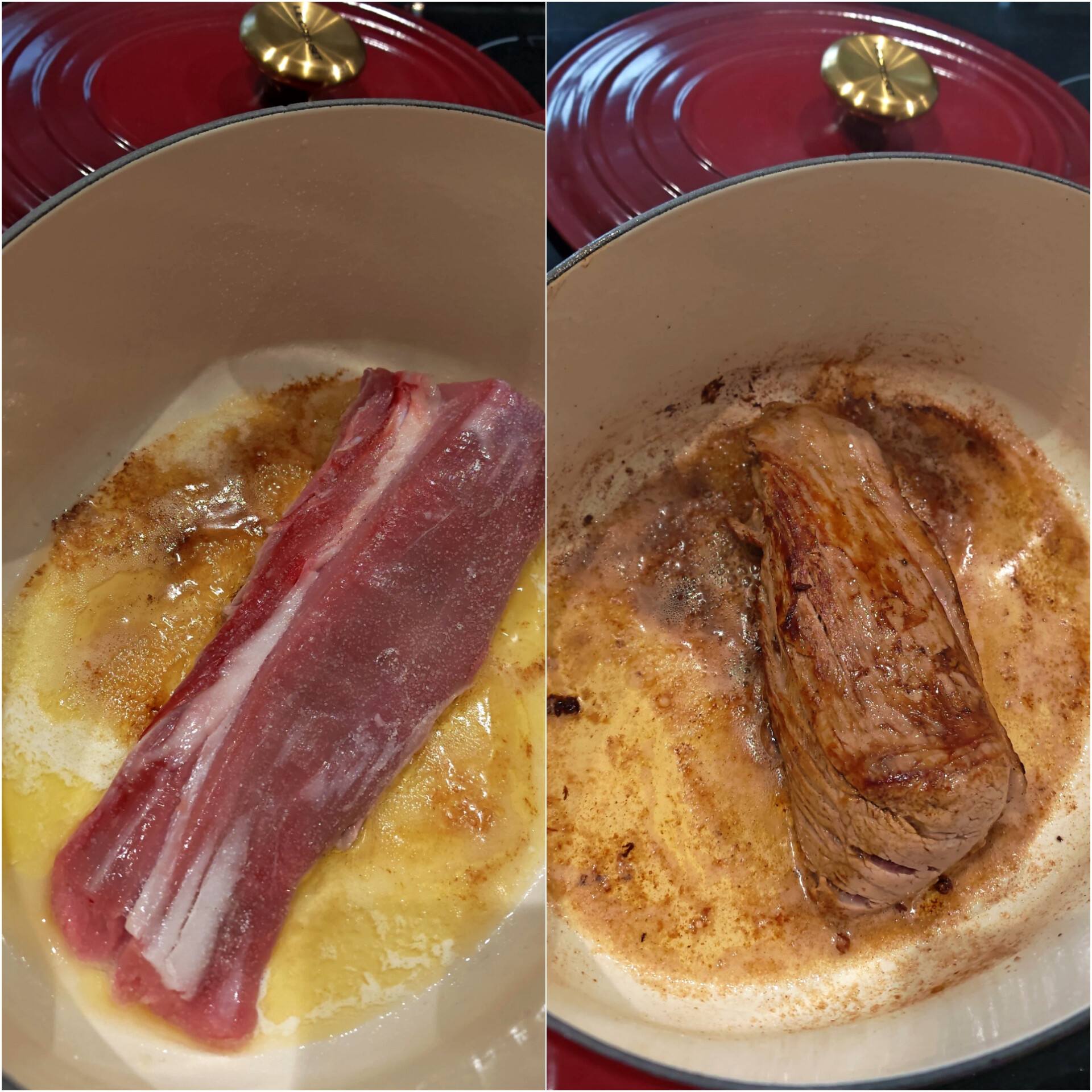 2. Faites chauffer le beurre dans une cocotte en fonte, sur le gaz/plaque. Ajoutez le filet et faites le dorer de tous les côtés puis retirez le