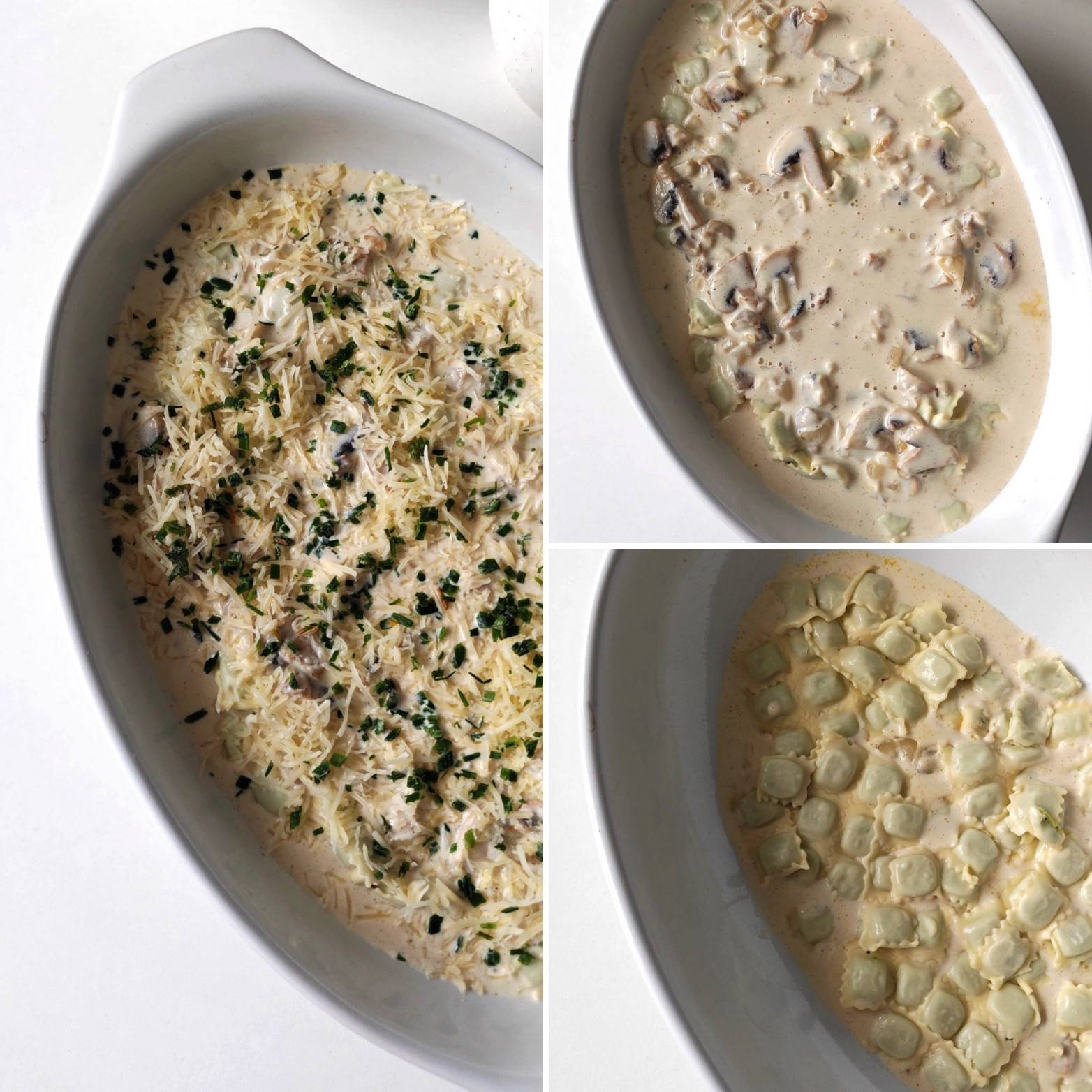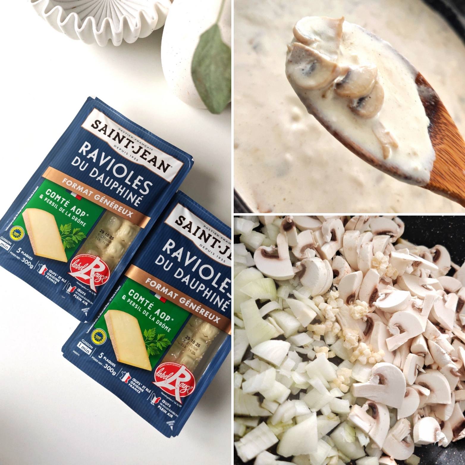 600gr de ravioles du Dauphiné (2 paquets de 300gr/10 plaques) + 200gr de champignons frais + 1 oignon + 2 gousses d’ail + 600ml de crème liquide 30%mg + 1cs de fromage à tartiner type St Môret + 2cs d’huile neutre + fromage comté râpé + ciboulette + sel/poivre