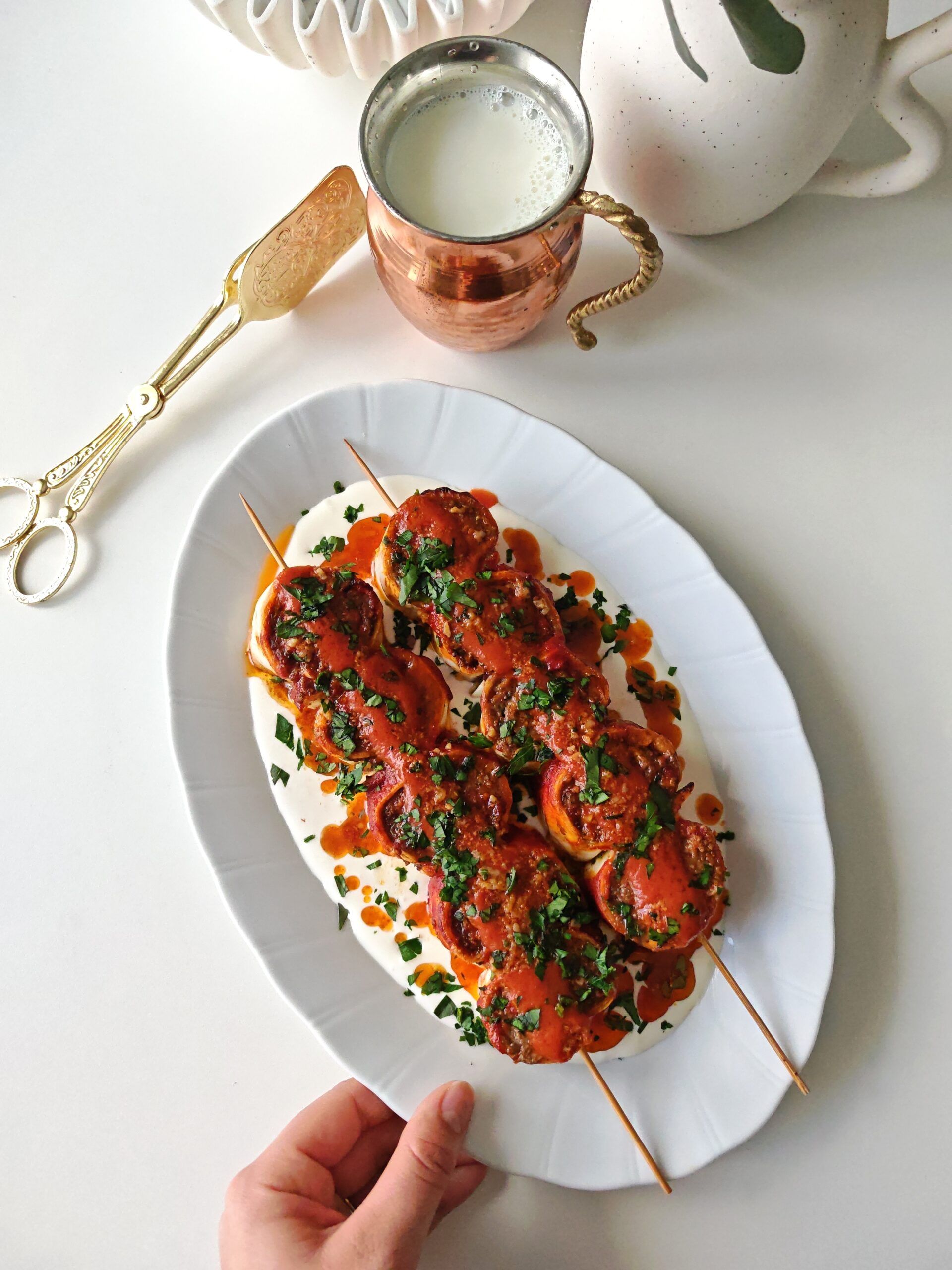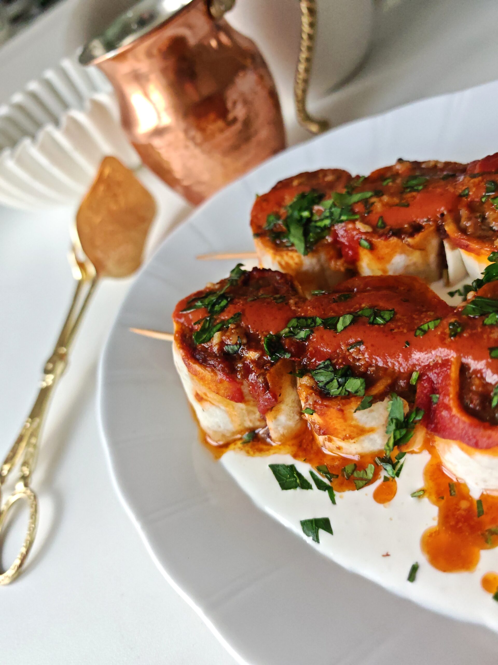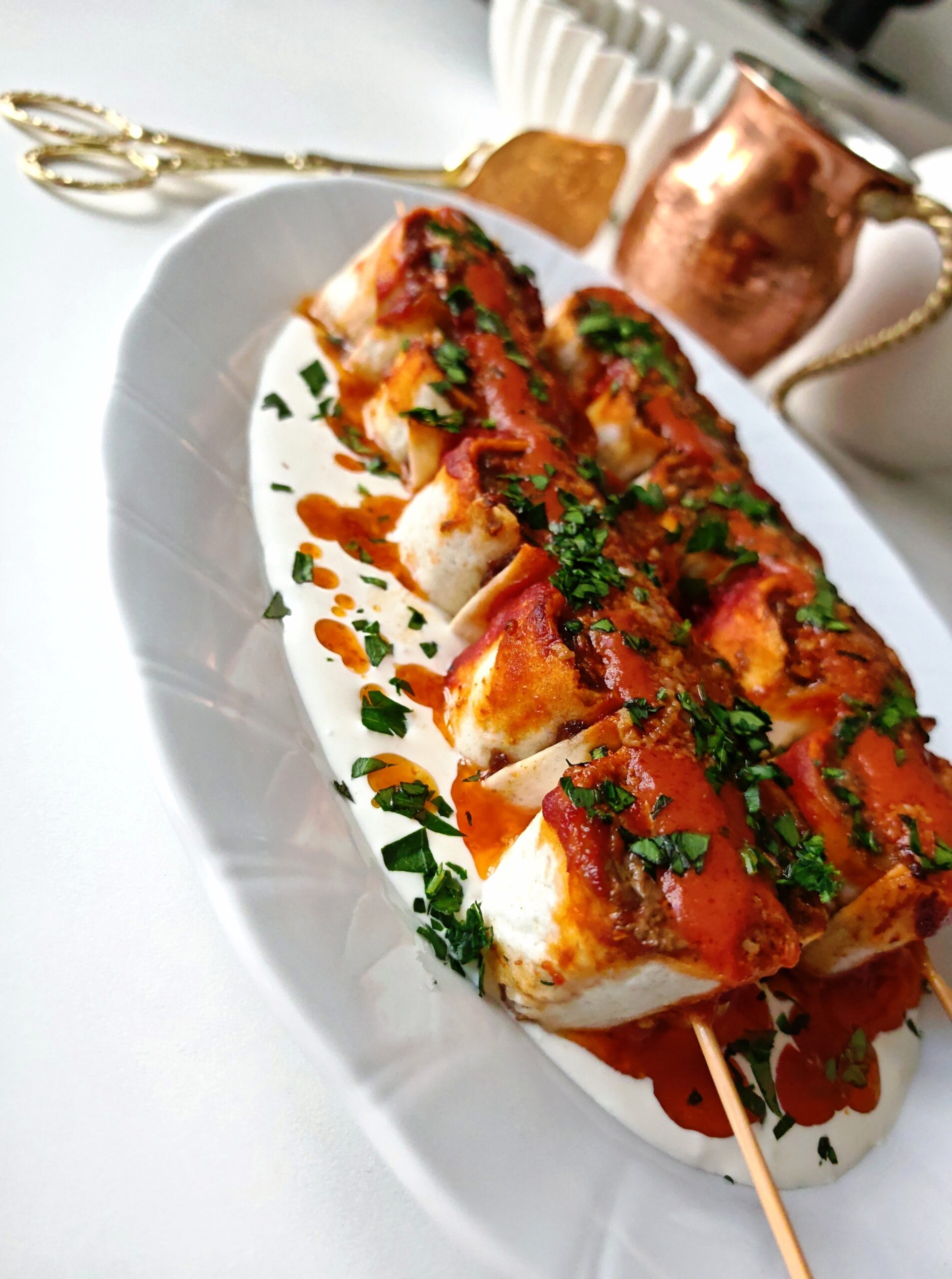 Une viande bien parfumée et moelleuse, roulée dans un pain dürum, nappée de sauce tomate et d’une sauce au beurre légèrement pimentée, le tout servi sur un yaourt à l’ail onctueux. Franchement..difficile de résister