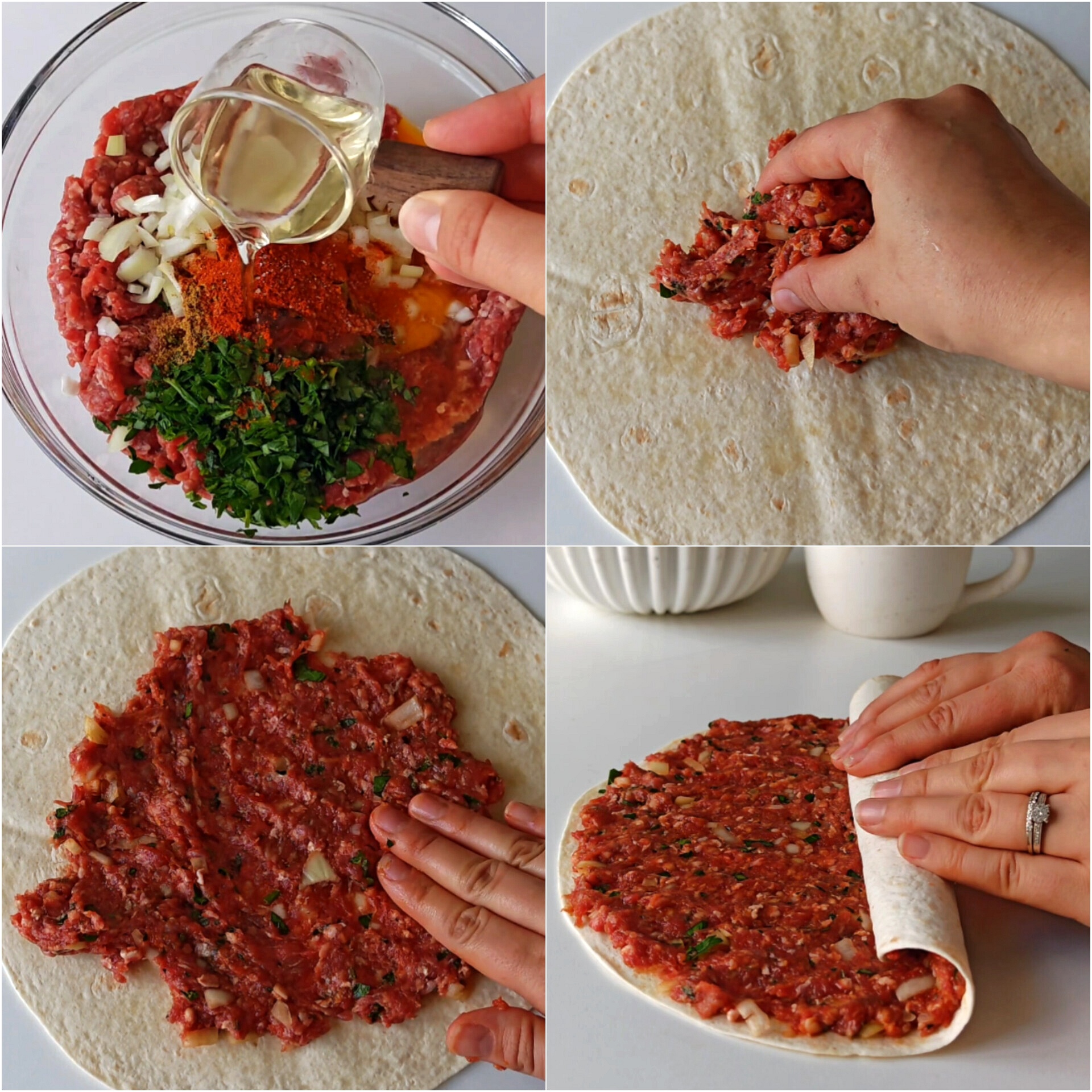 Kebab rolls : 3 galettes dürum + 500gr de boeuf haché (ou mélange agneau/boeuf) + 1 petit oignon + 1 gousse d’ail + 1 poignée de persil + 1/2cc de menthe séchée + 1 oeuf + 1cs d’huile neutre + 1cc de piment fort en poudre (ou paprika) + 1/2cc cumin + sel