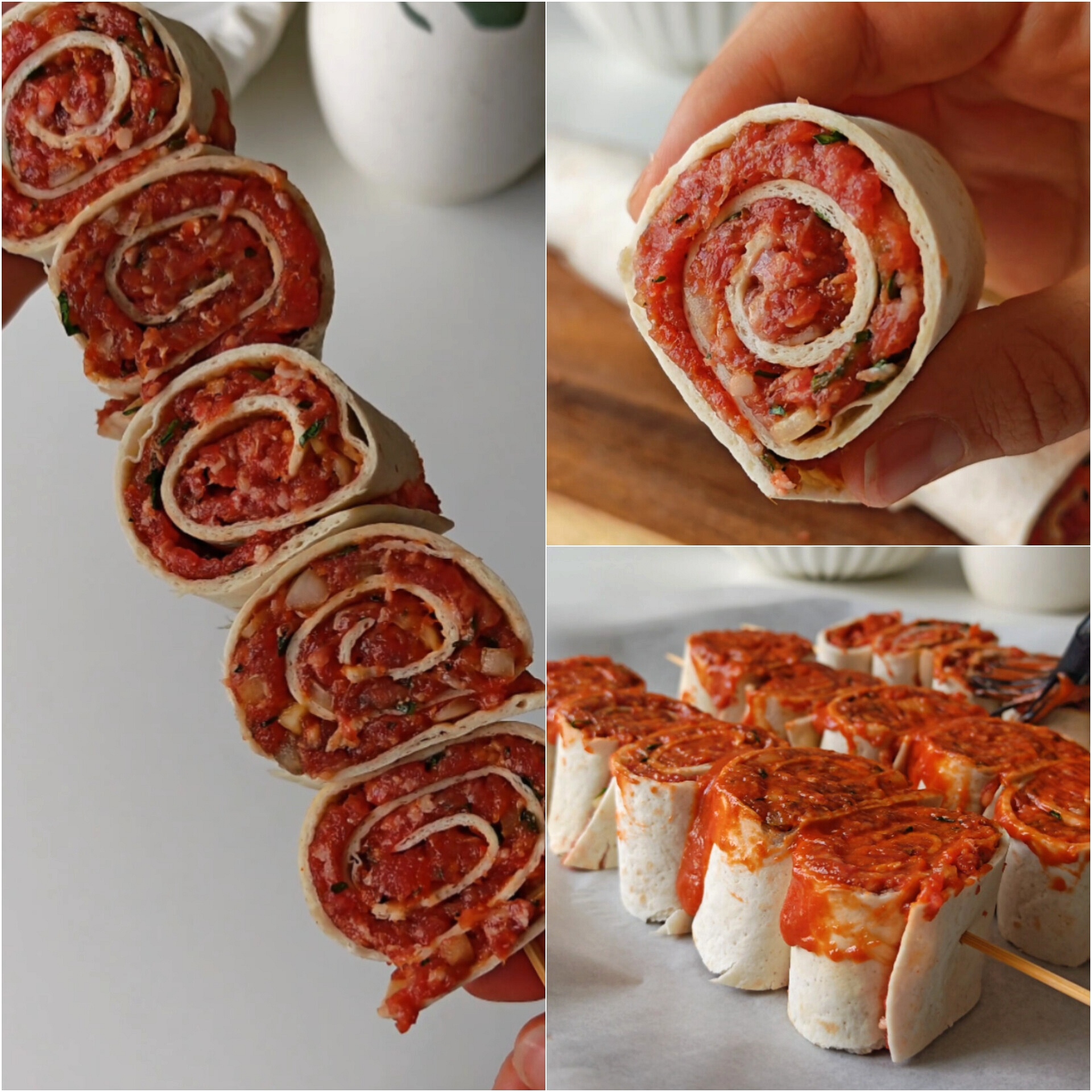 2. Étalez finement un peu de cette farce à la viande sur l’ensemble d’une galette dürum. Roulez en boudin serré puis coupez des petits tronçons. Procedez ainsi jusqu’à épuisement des ingrédients