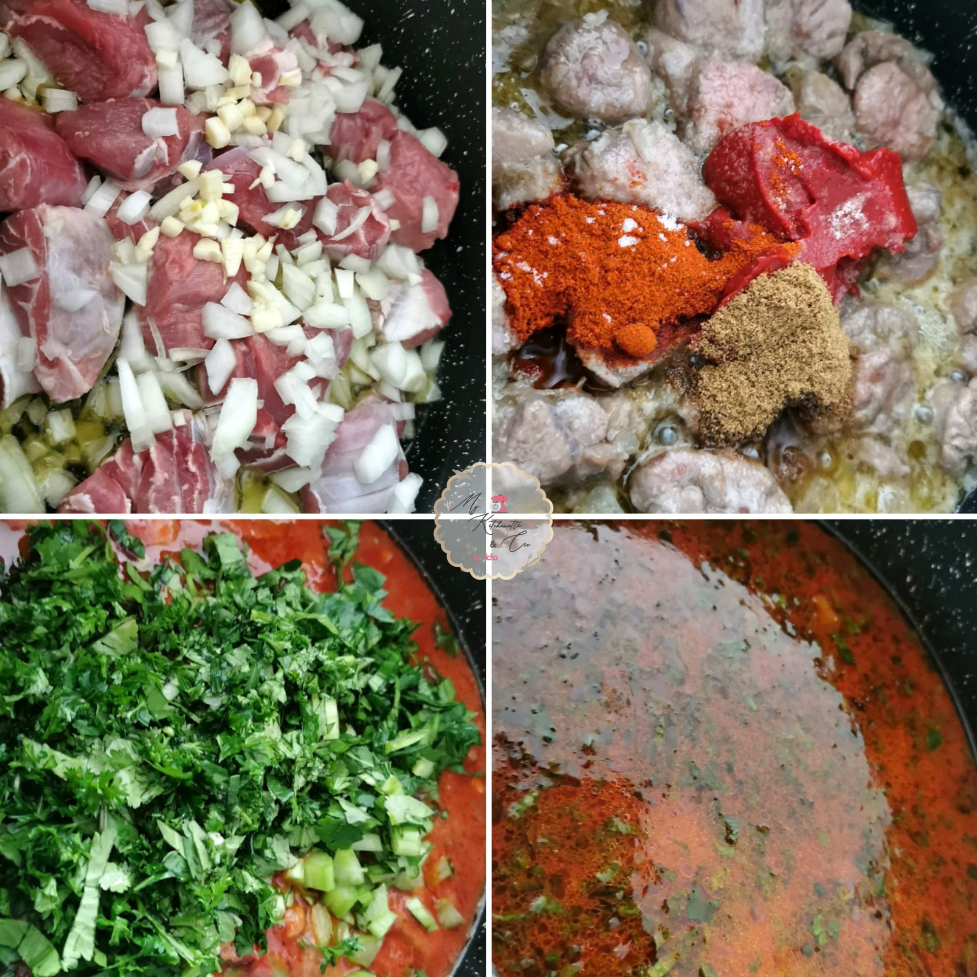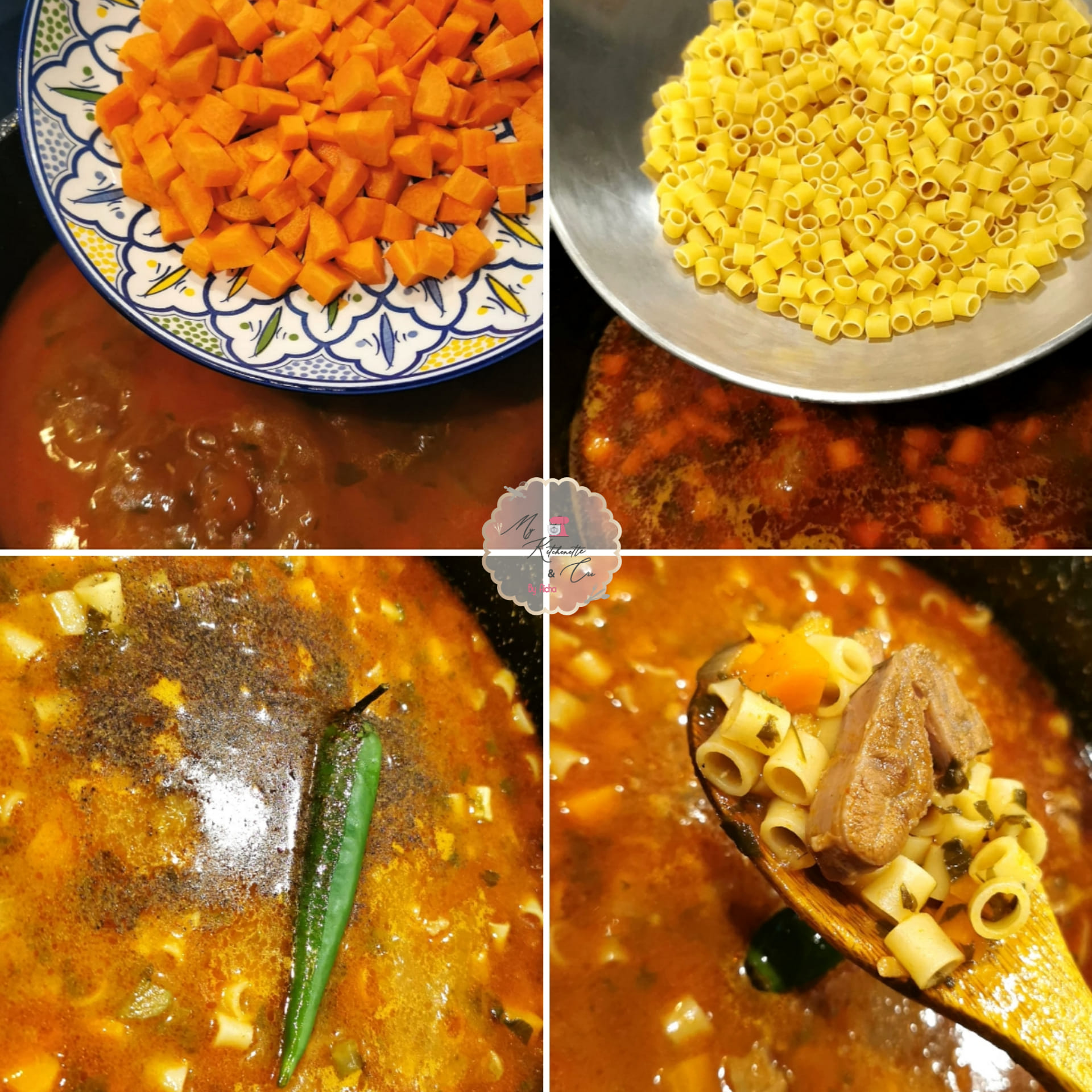 250gr de viande de gigot (ou épaule, poitrine d’agneau/mouton) ou encore du veau (poitrine, épaule, jarret) + 1 branche de céleri (branche + feuilles) + une poignée de coriandre + une poignée de persil + 1 petit oignon + 2 gousses d’ail + 3cs d’huile d’olive + 2cs de concentré de tomates + 1cc de tabel karouia (épices tunisienne) + 1cc de piment en poudre + 2 carottes + 1 petit piment vert + 300gr de pâtes (ici Fell warda) + sel/poivre + 200ml d’eau + environ 1,5L d’eau