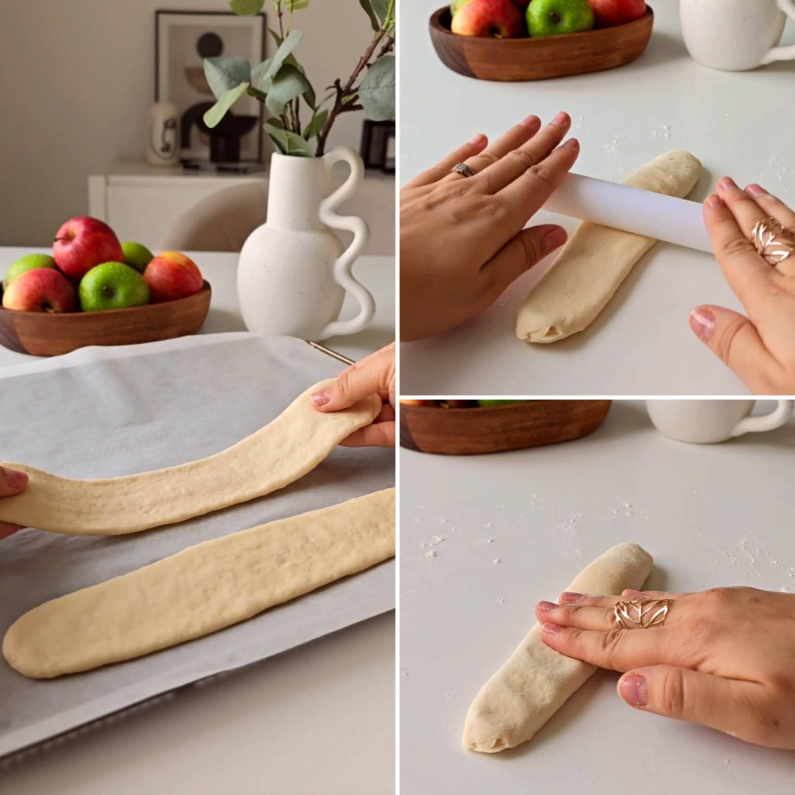 7. Étalez chaque boule en un rectangle arrondi à l’aide d’un rouleau puis roulez la pâte afin de former un boudin. Pincez bien les bords, retournez le boudin, appplatissez au rouleau en gardant une épaisseur d’1cm