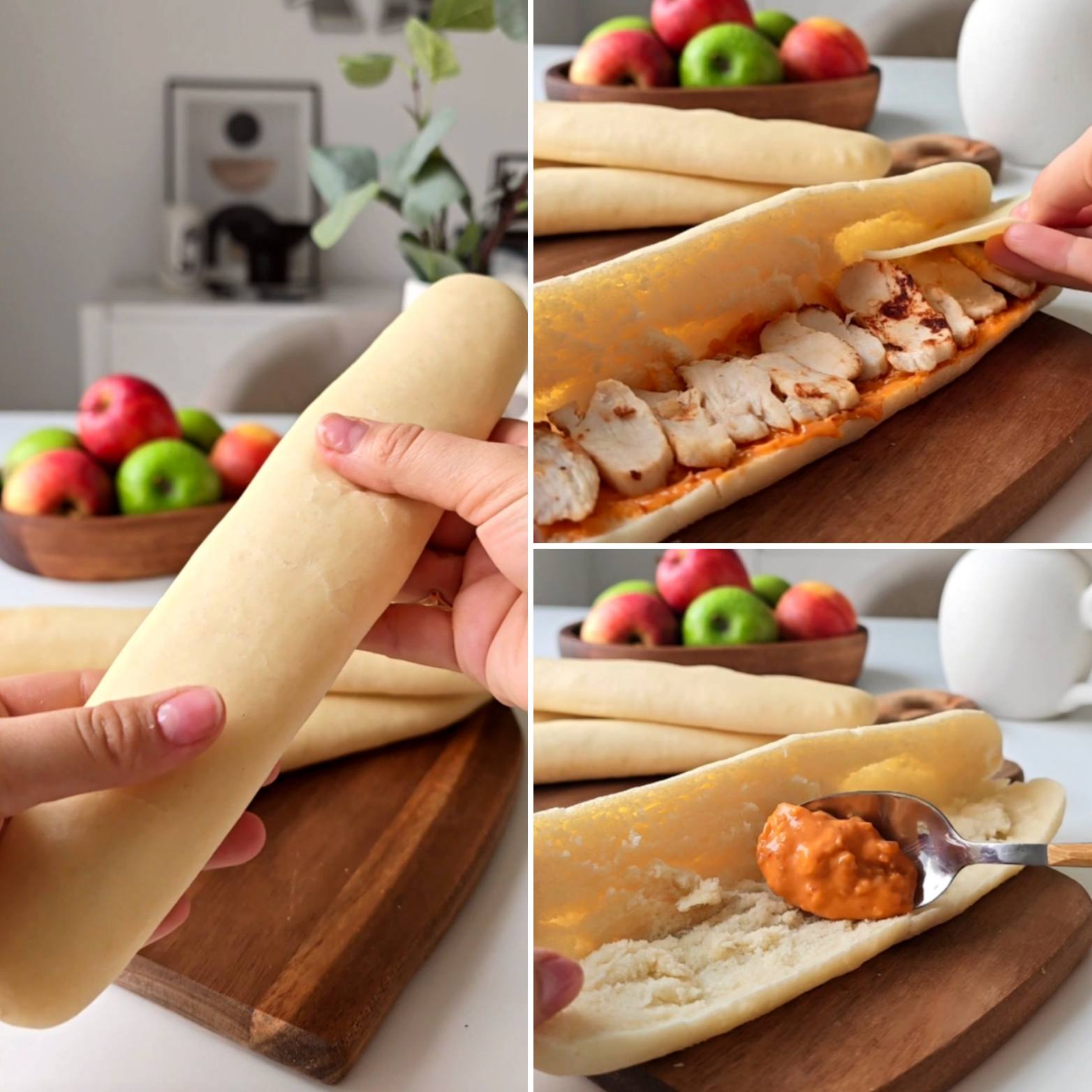 11. Ouvrez les pains, étalez la sauce,ajoutez poulet, fromage,refermez, placez sous le grill