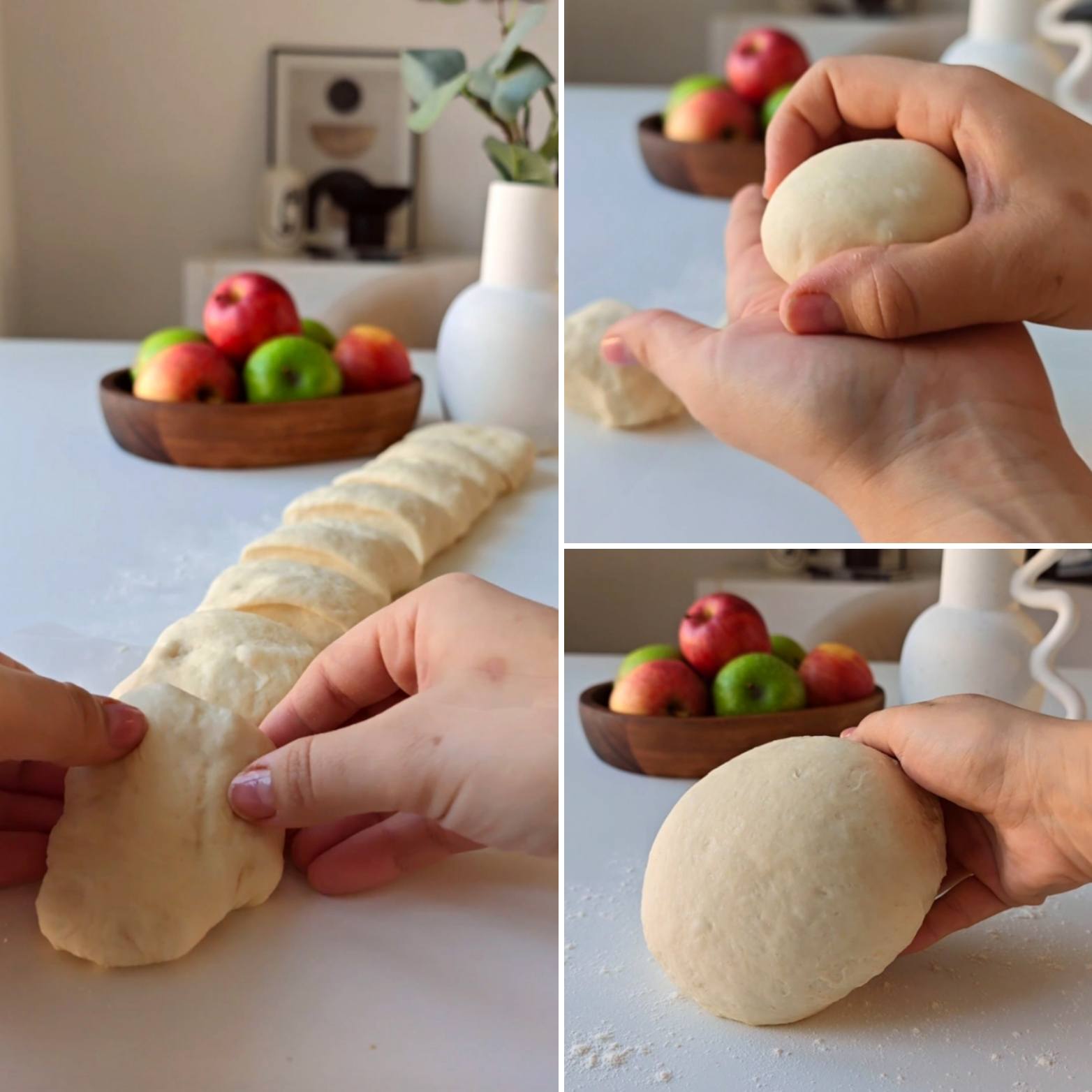6. Dégazez la pâte, divisez la en 6/8 boules selon la taille du panini. Disposez les sous un linge, laissez 10min