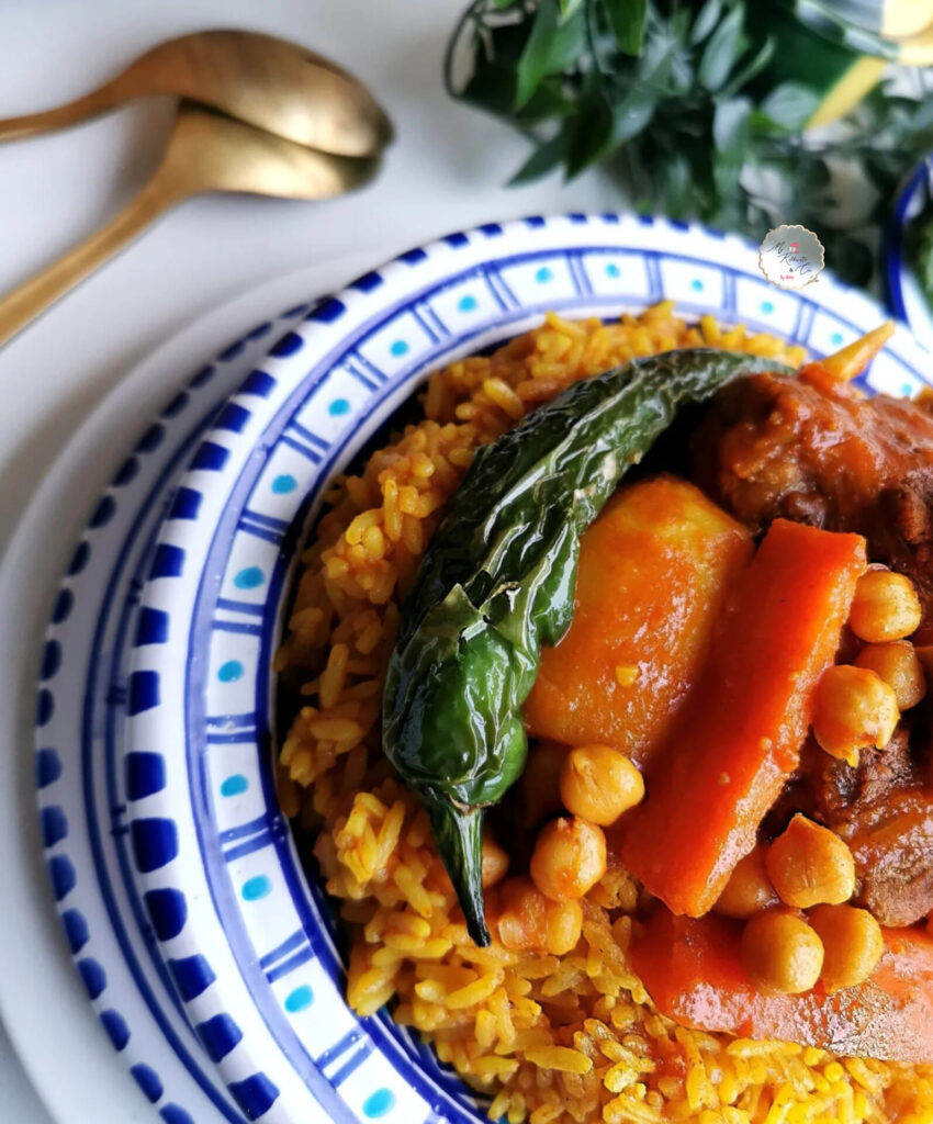 1/2 épaule d’agneau (environ 700gr) + 500gr de riz + 1 oignon + 3cs de concentré de tomates + 1,5cc de curcuma + 1/2 cs de piment en poudre (felfel ahmar selon les goûts) + 3cs d’huile neutre + 4 carottes + 2 pommes de terre + 150gr de pois chiches prêt à l’emploi en bocal + 4 piments verts piquant (ou doux selon les goûts) + 3 clous de girofles + sel/poivre