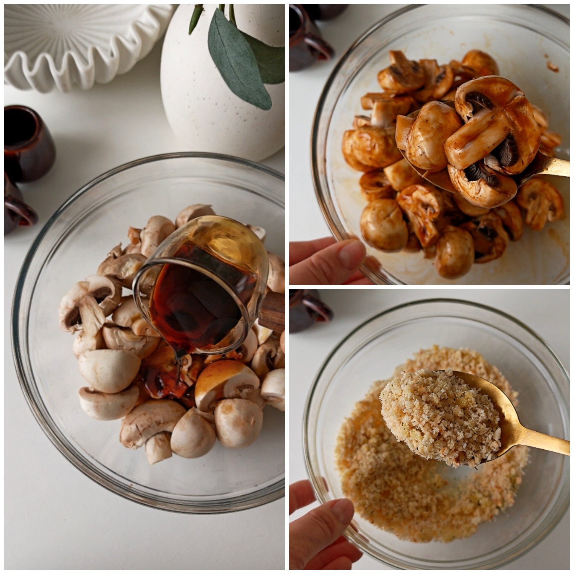 Champignons : 250gr de champignons frais + 1cs huile d’olive + 1cs de sauce soja salée + 1cs de sauce soja sucrée + poivre