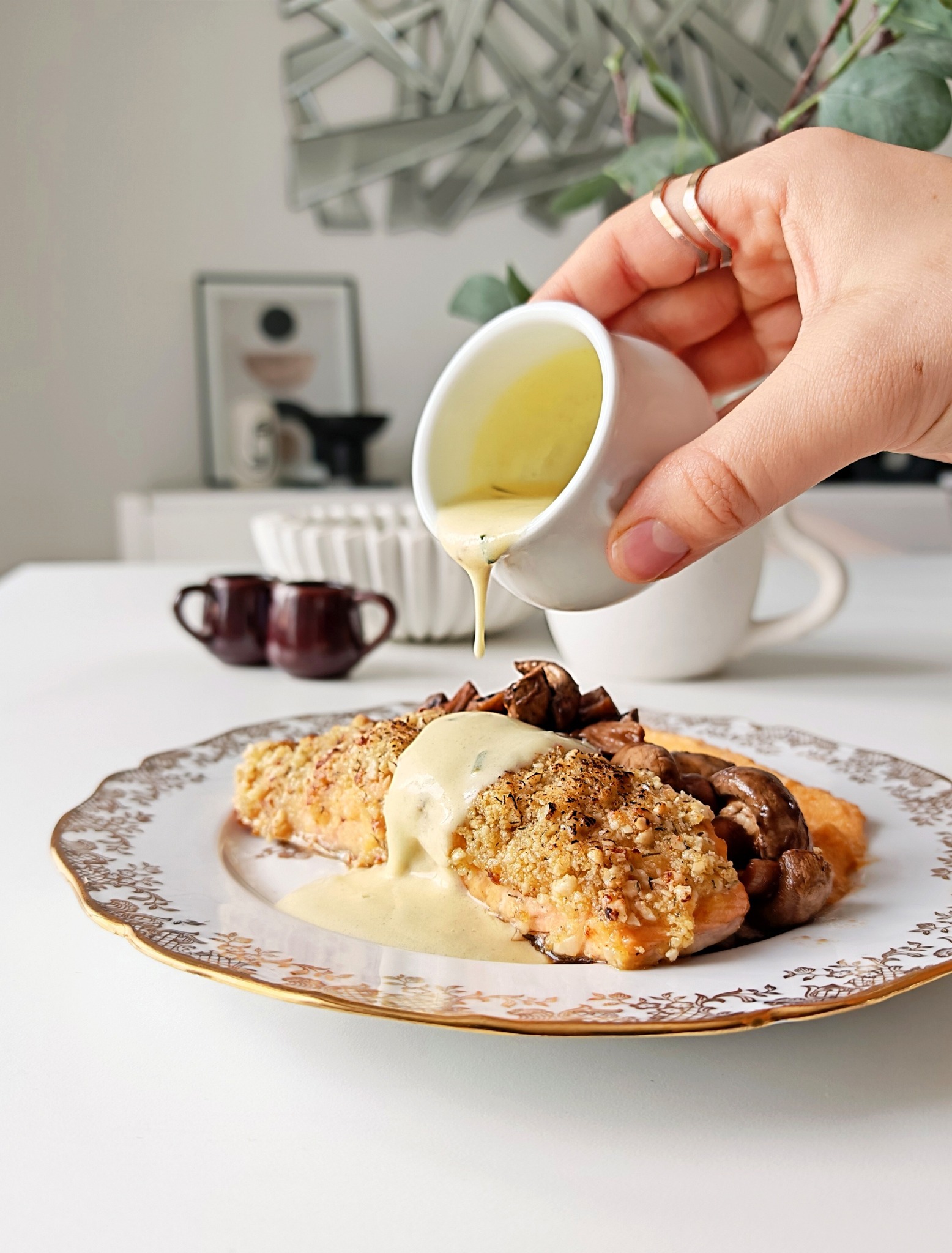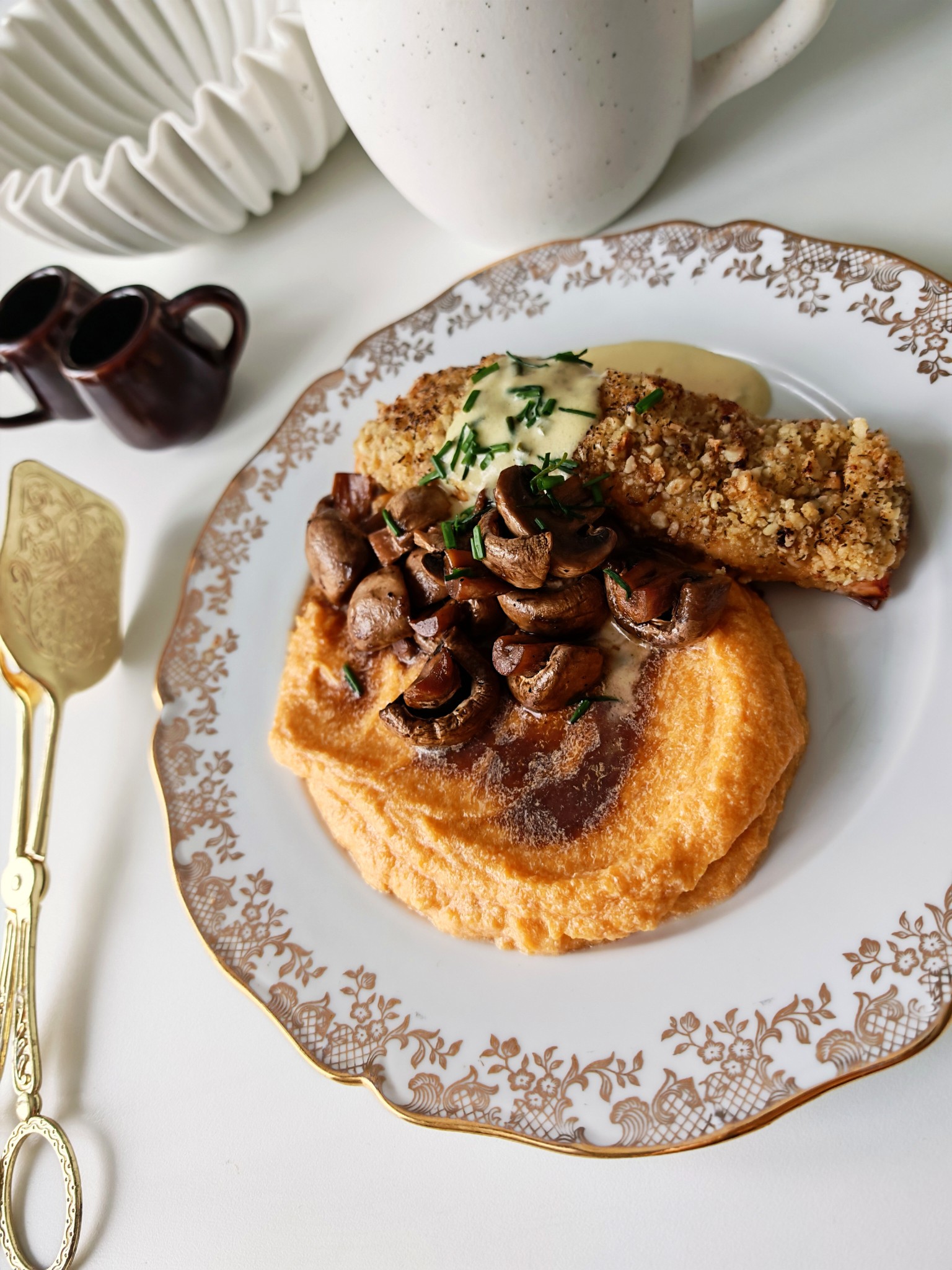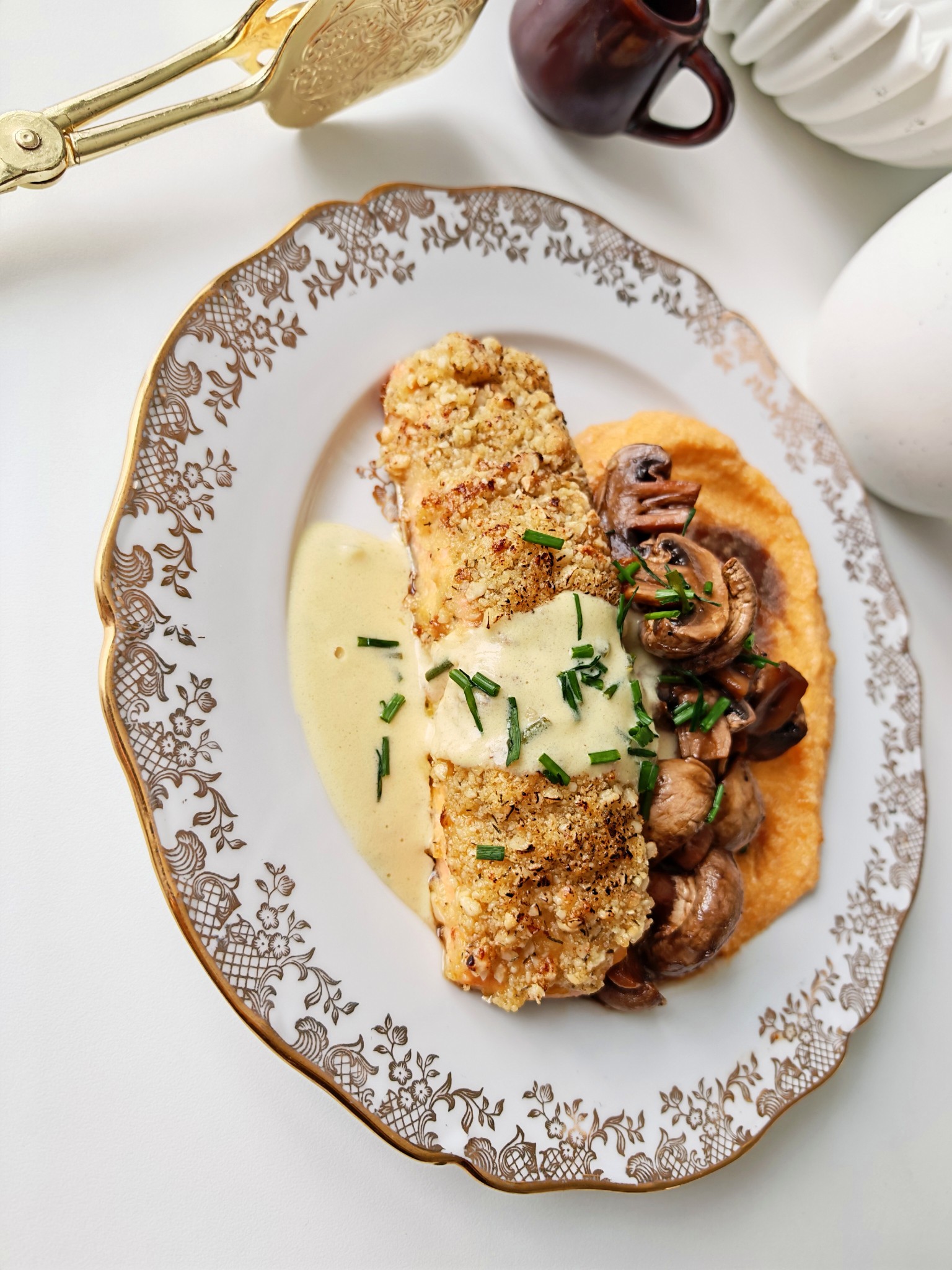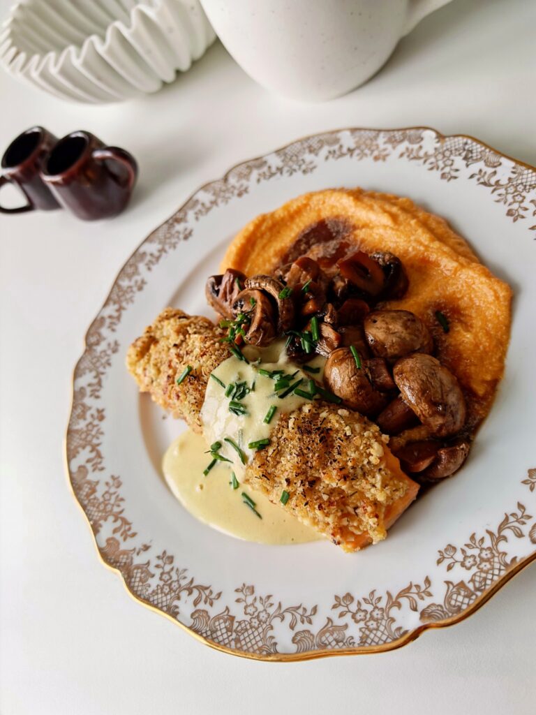 Saumon en croûte sauce citronnée, purée de butternut & champignons rôtis