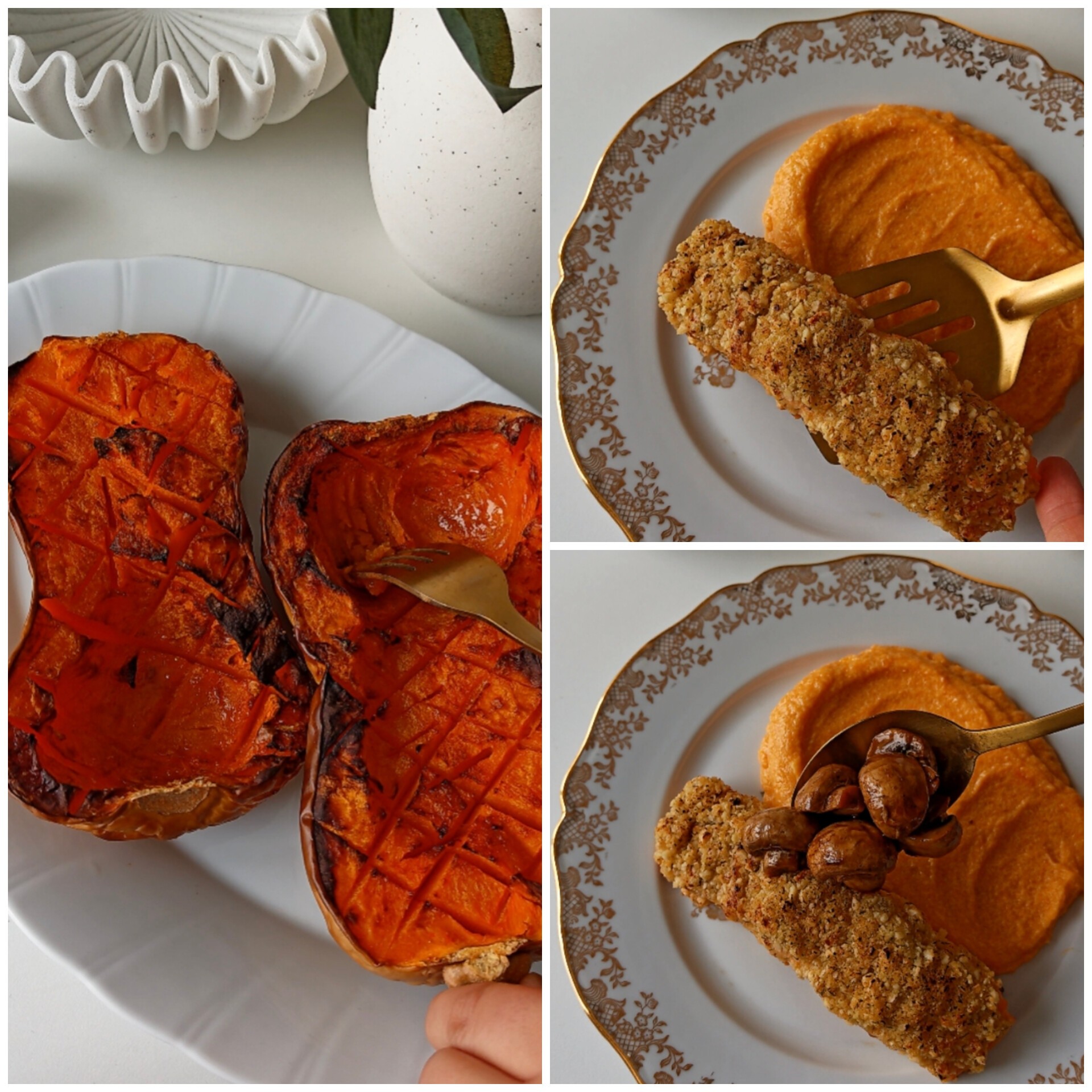 Purée de butternut : 1 petite butternut + 20gr de beurre + 2cs de crème fraîche épaisse en pot + huile d’olive + sel + paprika