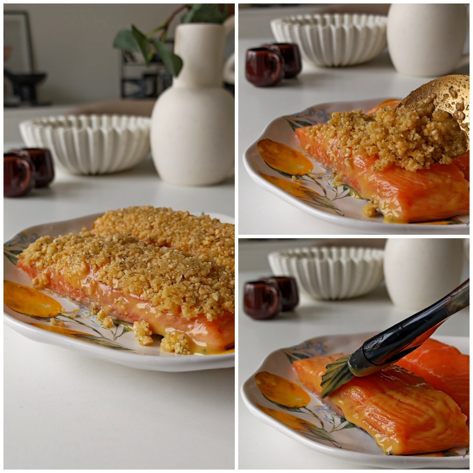 Saumon : 3 pavés de saumon + 1cs de moutarde + 1cs de miel + 40gr de noisettes torréfiées + 30gr de parmesan en poudre + 1cs de chapelure + 2cs d’huile d’olive + sel