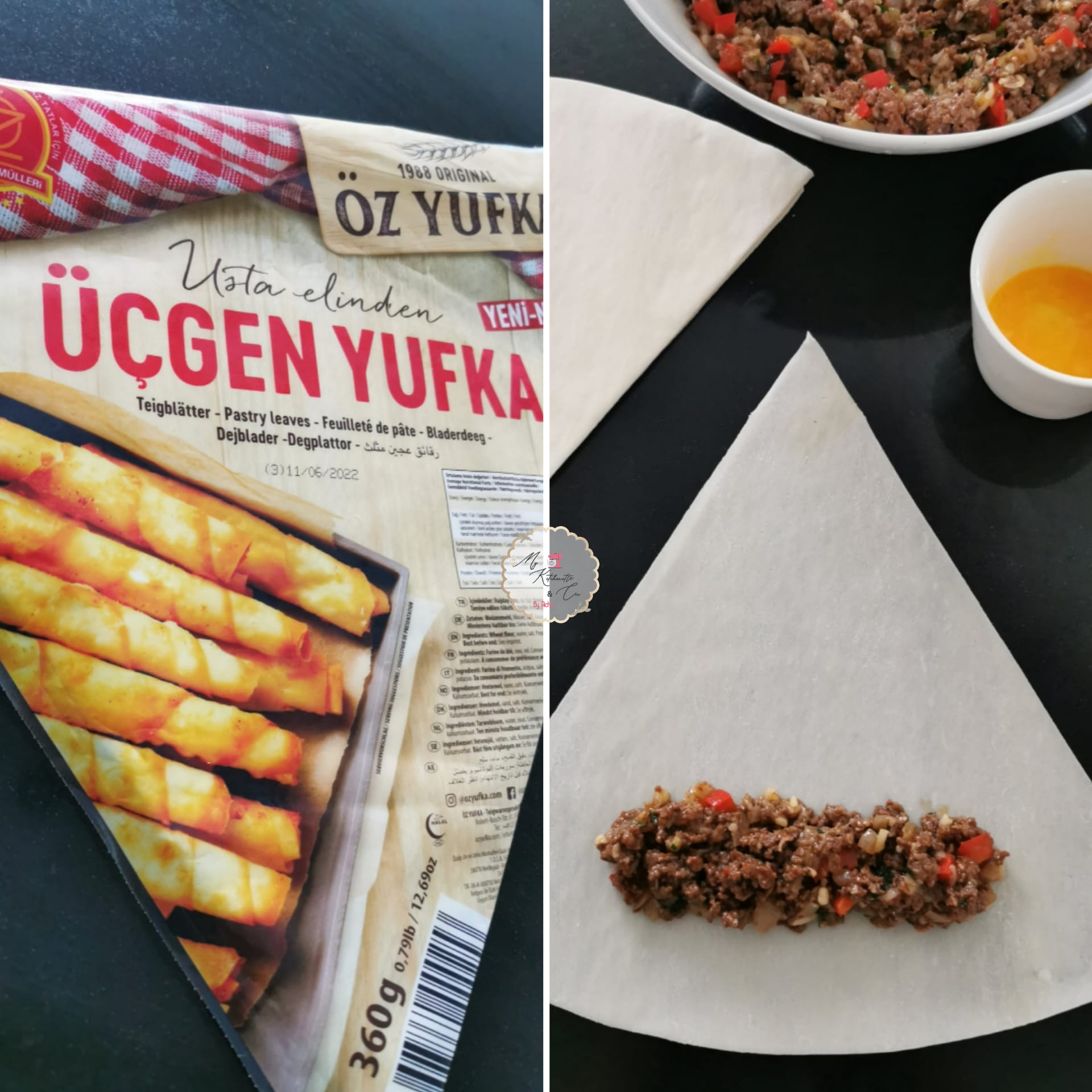 350gr de bœuf haché + 1 oignon + 1 petit poivron rouge + 1 poignée de persil + 2cs d’huile d’olive + 1cc de concentré de tomate + 1/2cc de piment fort (ou paprika) + 1/4cc de Sumac (ou 1cs jus de citron) + sel/poivre + 1 oeuf + 50gr de fromage râpée type mozzarella + 18 feuilles de yufka (triangle) + 1 jaune d’oeuf